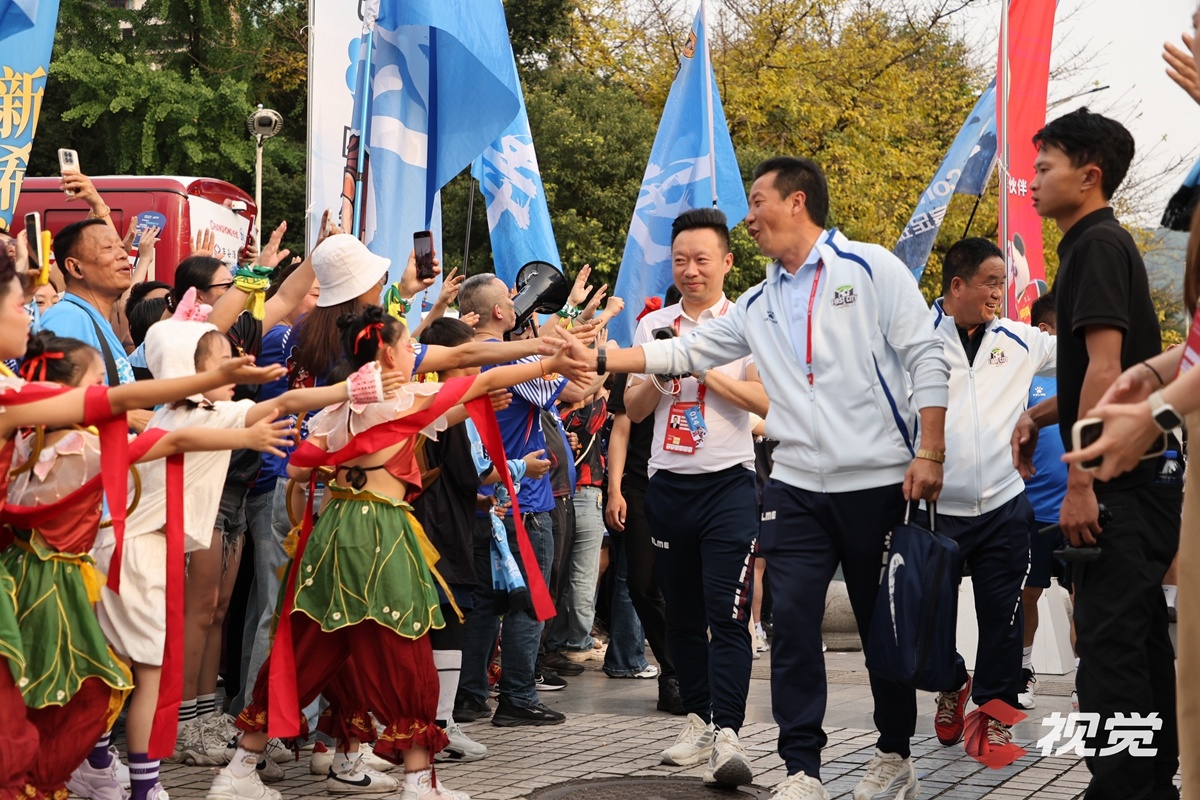 4月25日,宜宾长江首城队主场迎战绵阳九洲长虹队。图为赛前”小哪吒“欢迎宜宾队入场。C视觉签约摄影师 彭珉翔 摄
