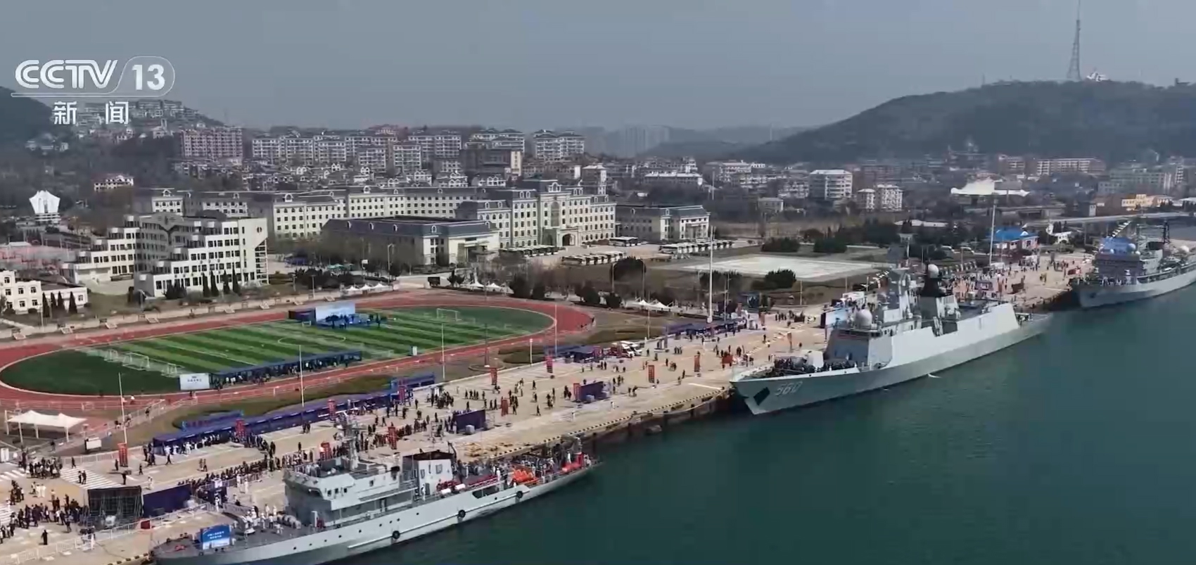 ▷连日来,海军在全国多个城市同步举行舰艇开放活动,其中大连旅顺军港于25日首次正式面向公众开放。海军鄂尔多斯舰、郑和舰、青州舰三型舰艇公开亮相,市民登舰参观,近距离感受大国海军的风采。