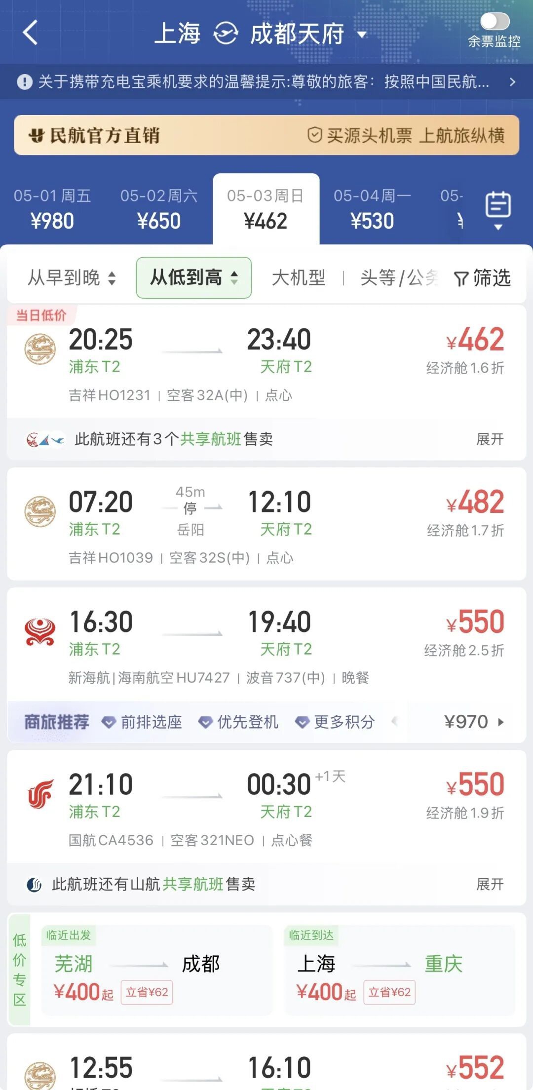 “成都是假期国内出游的热门目的地,以为飞成都的机票比较贵,结果查询后才发现还有不少低折数高优惠的票。”4月25日,上海市民黄先生查询时发现,假期从上海直飞成都部分航班尚有特价票,最低的为1.6折460元,便果断地下单预订机票,选择了到成都游玩。