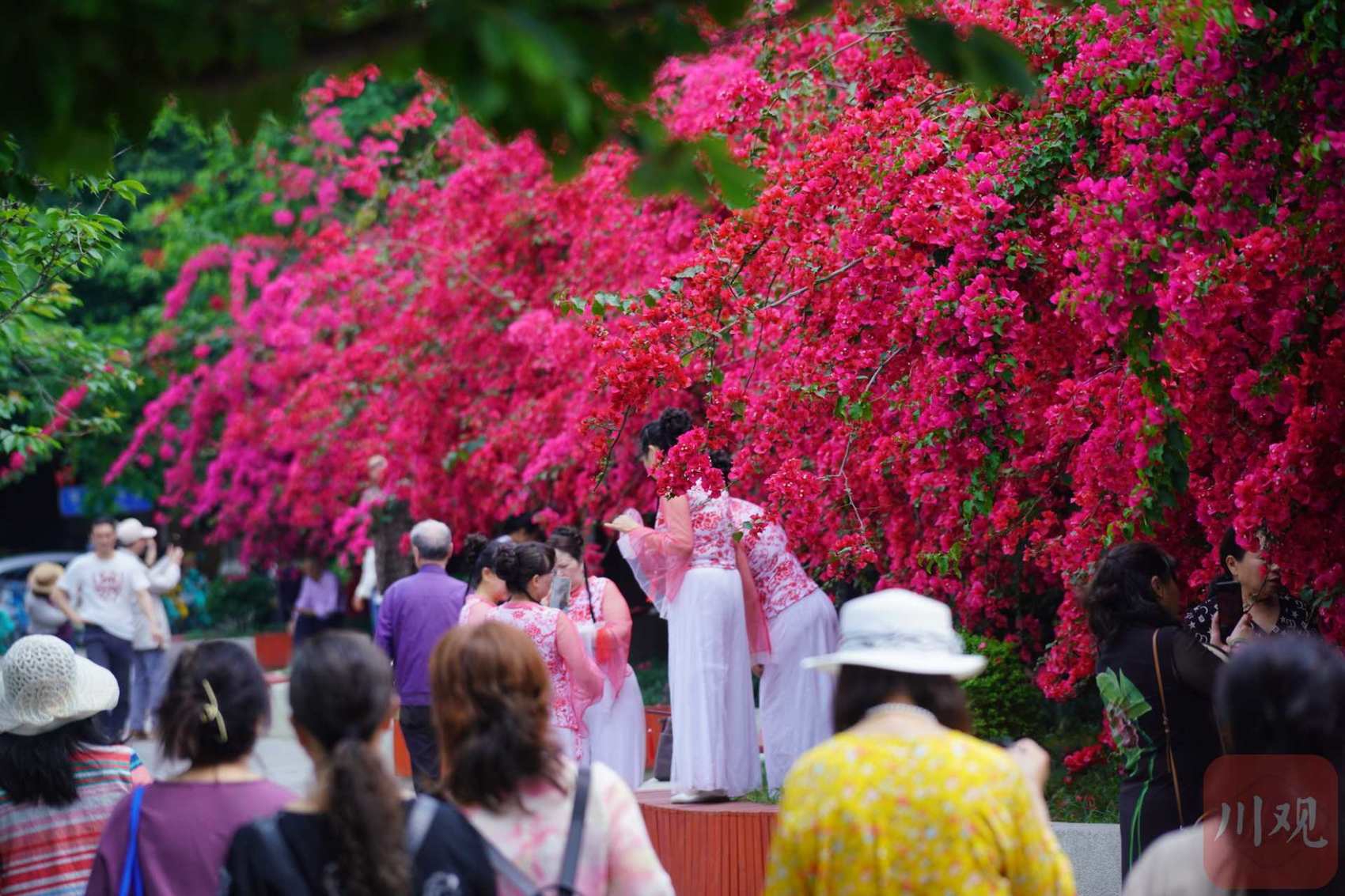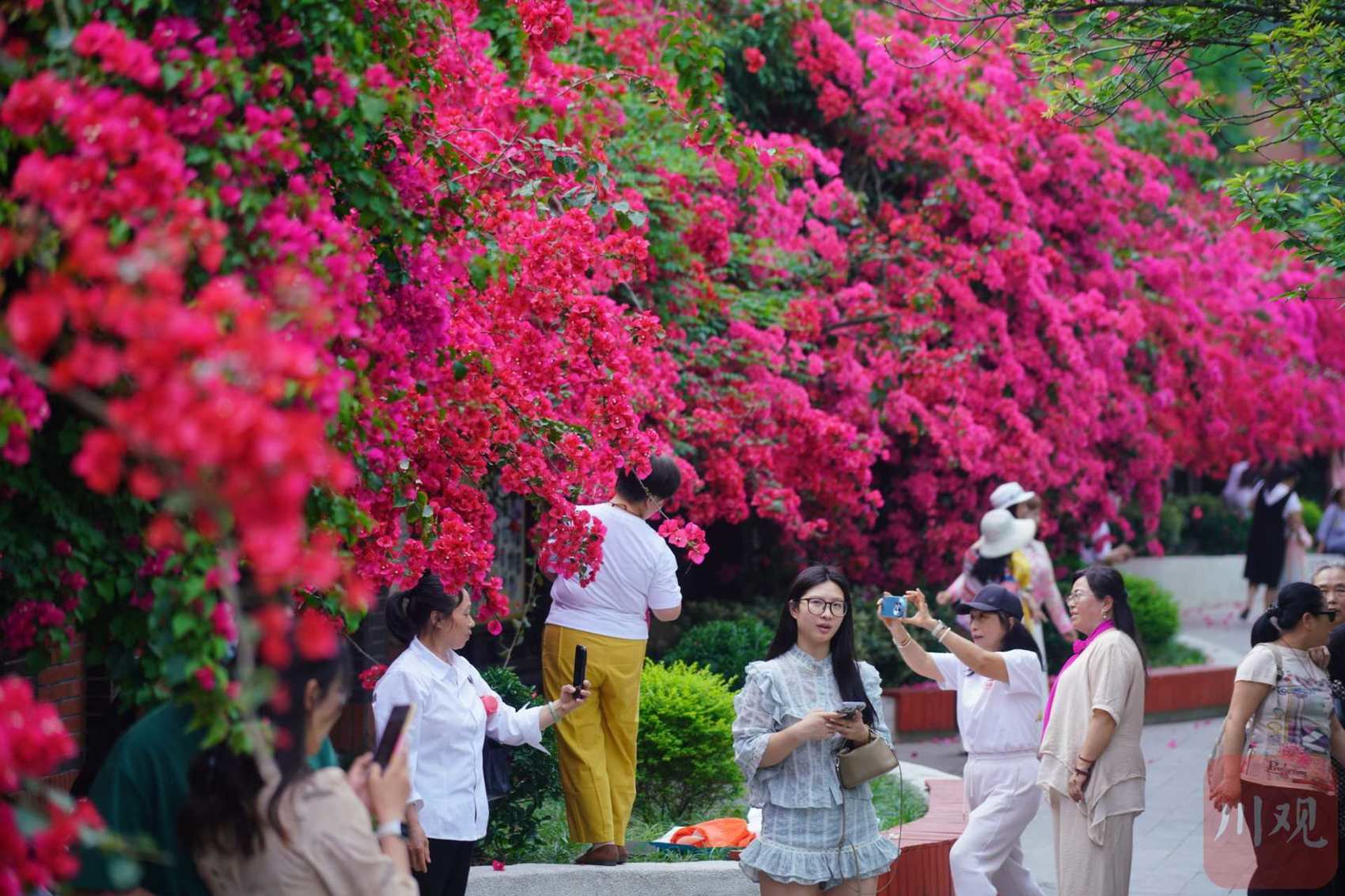 连片三角梅盛放成花瀑,市民游客驻足拍照打卡。