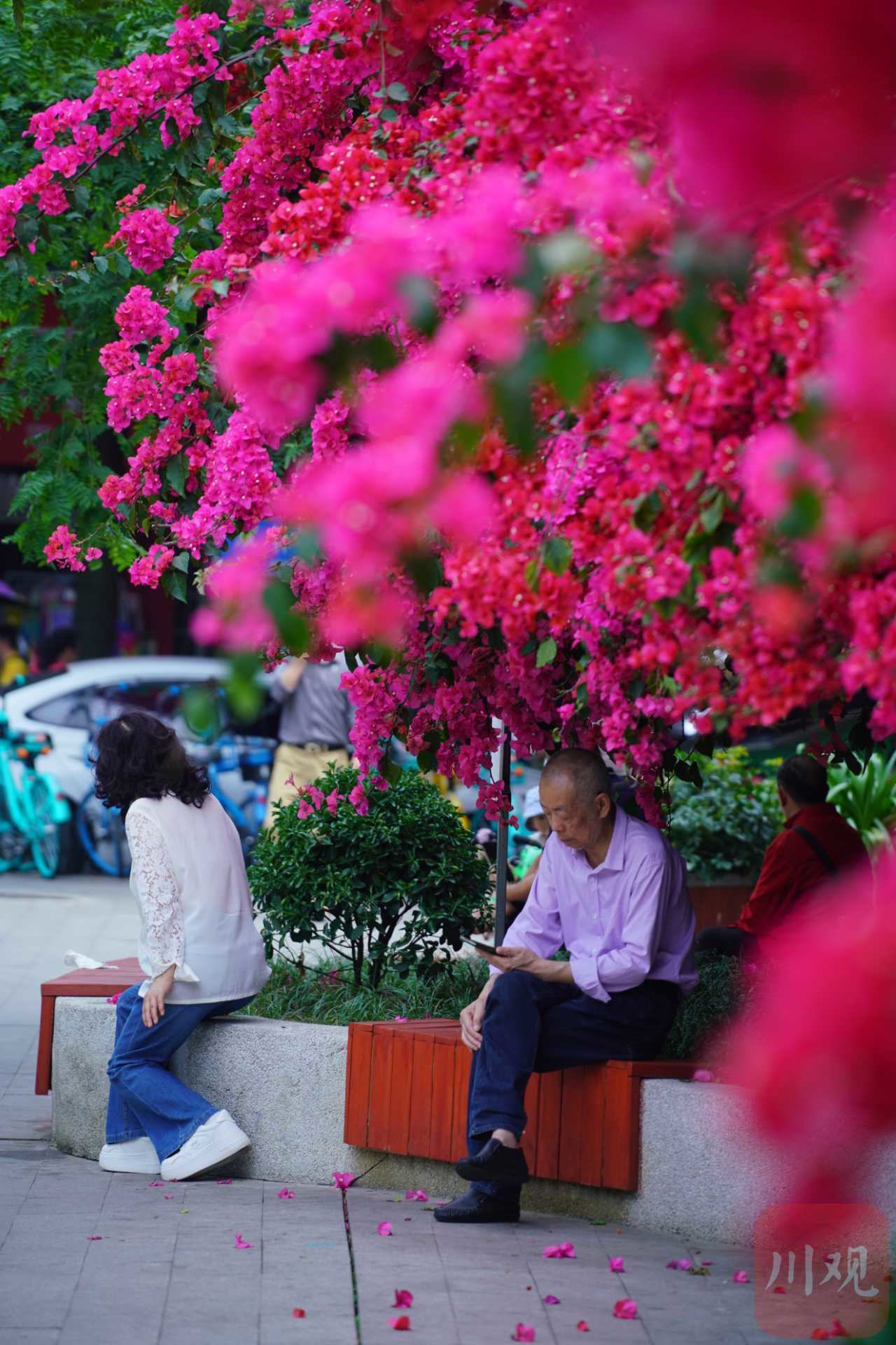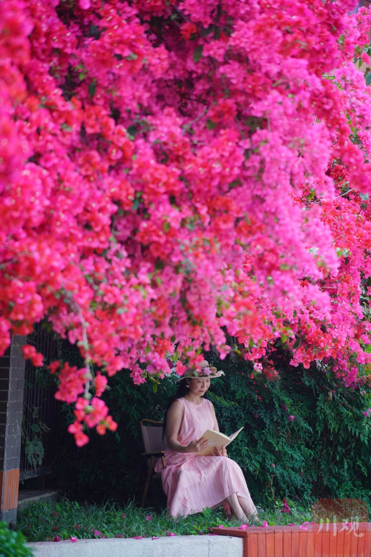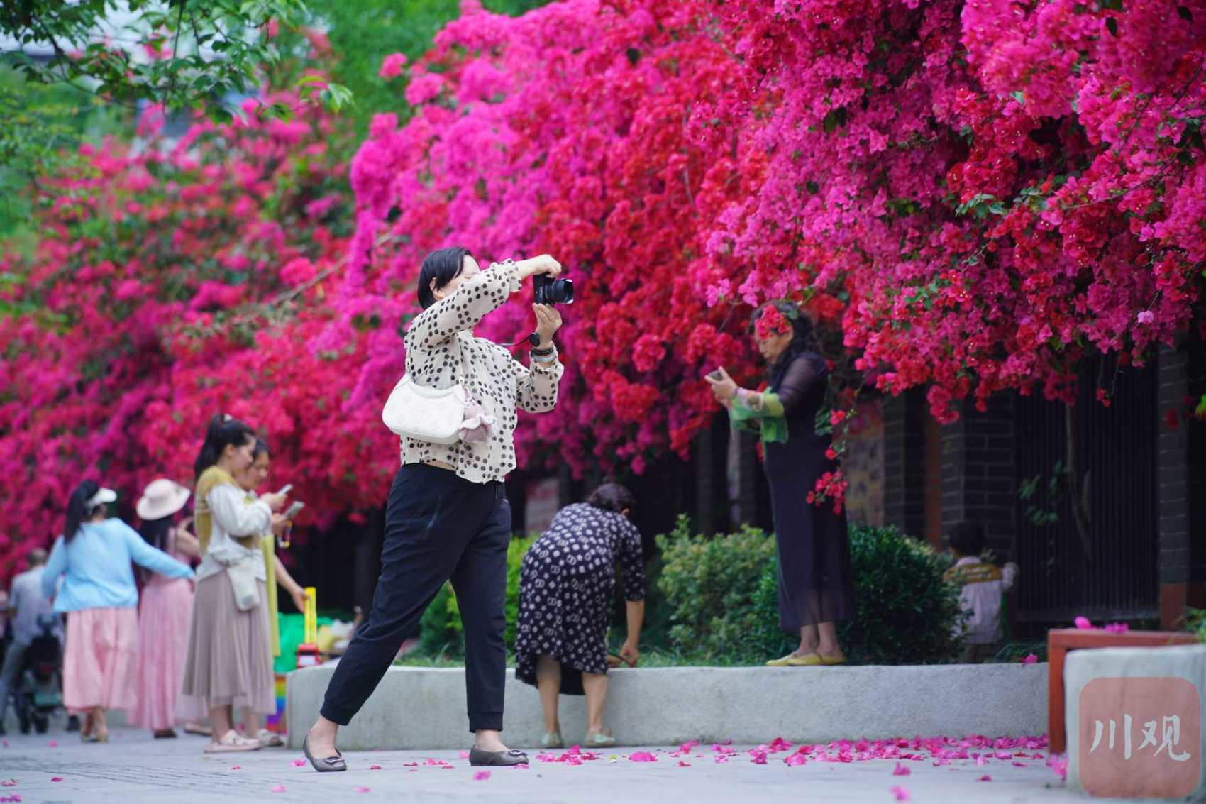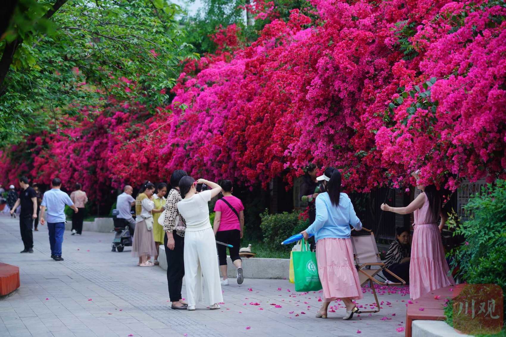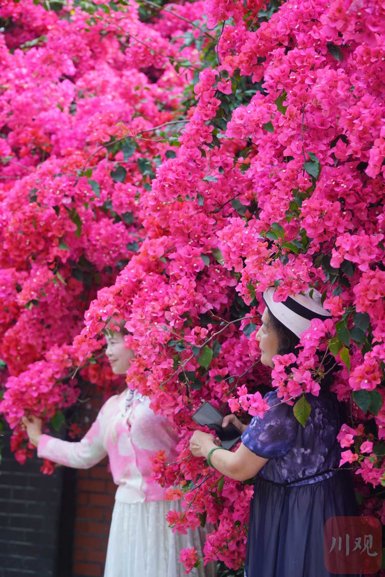 连日来,成都街头三角梅迎来盛放期,绚烂花瀑铺满街巷墙头,掀起全民追花热潮。4月26日,成华区双园巷三角梅悄然绽放,惊艳上线。紧邻列五中学的街巷里,繁茂花枝沿墙蔓延垂挂成瀑,艳红花簇错落交织,书香气韵与市井烟火温柔相融。