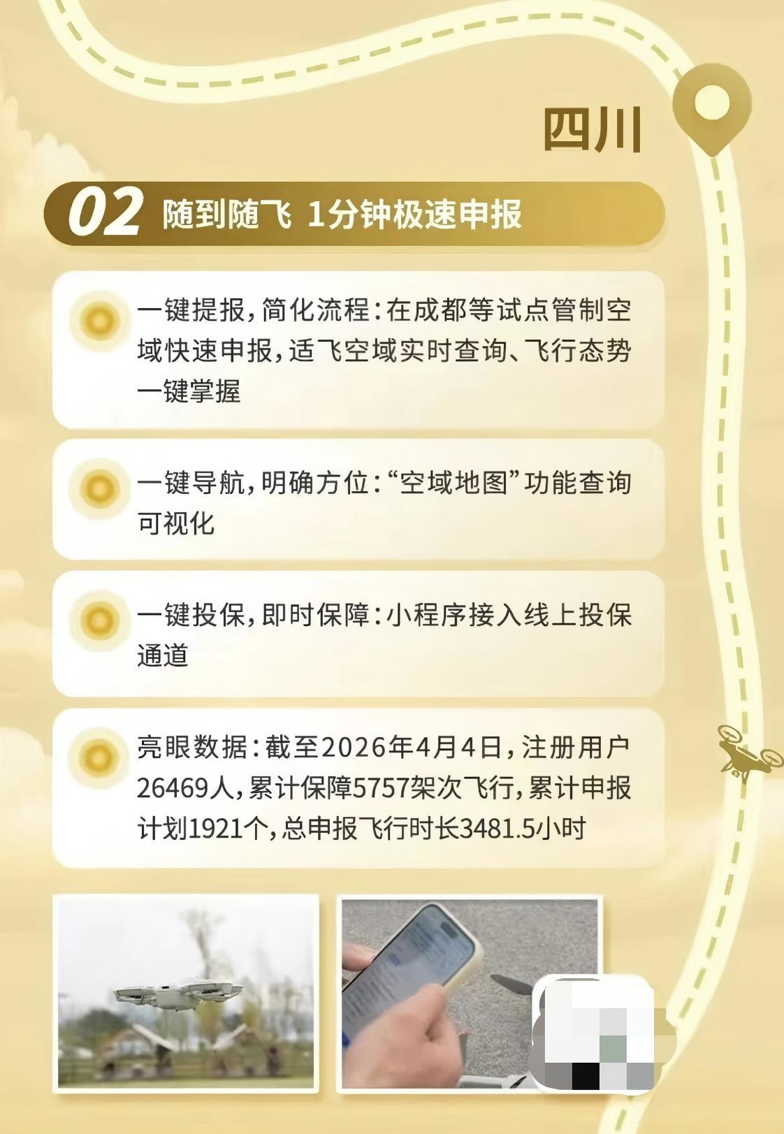 今年2月,四川依托国家民用无人驾驶航空器综合管理平台(UOM)打造省级低空飞行公共服务小程序“扫码飞”,并在近期进行重大更新,向全省适飞空域开放查询功能,并同步推出 “一键查询、一键报备、一键导航、一键投保”新功能。截至4月17日,累计注册用户超28579人,累计保障7060架次飞行,累计申报计划2814个,总申报飞行时间4267小时。