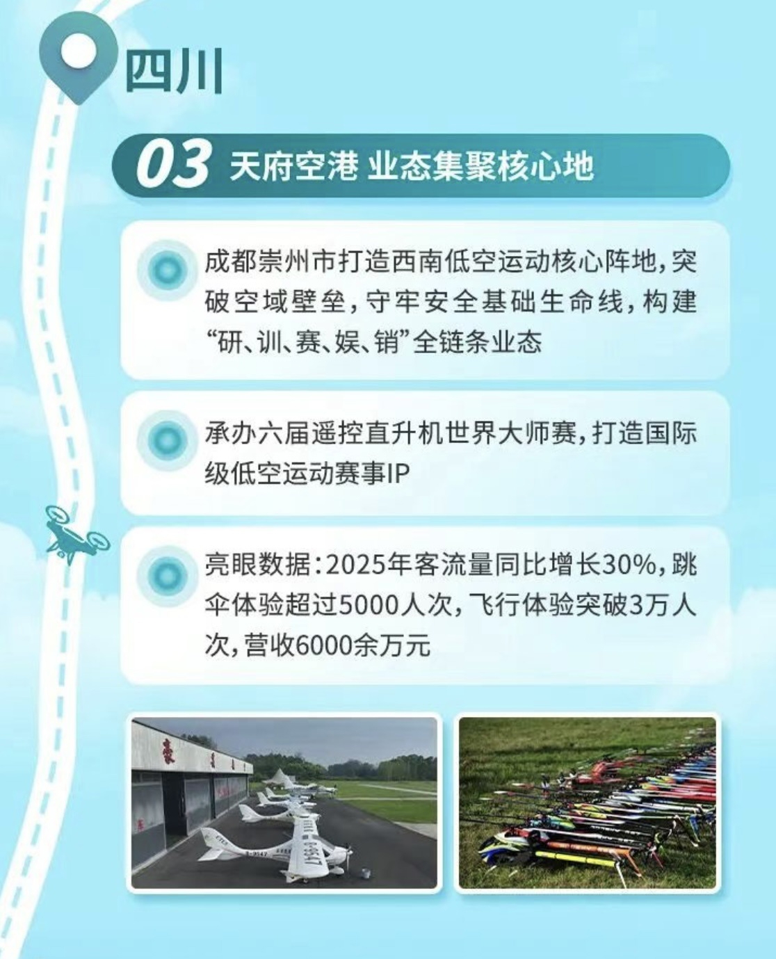 本次入选的成都崇州市正在打造西南低空运动核心阵地,突破空域壁垒,守牢安全基础生命线,构建“研、训、赛、娱、销”全链条业态,通过承办六届遥控直升机世界大师赛,打造国际级低空运动赛事IP。目前取得了较为亮眼的数据:2025年客流量同比增长30%,跳伞体验超过5000人次,飞行体验突破3万人次,营收6000余万元。