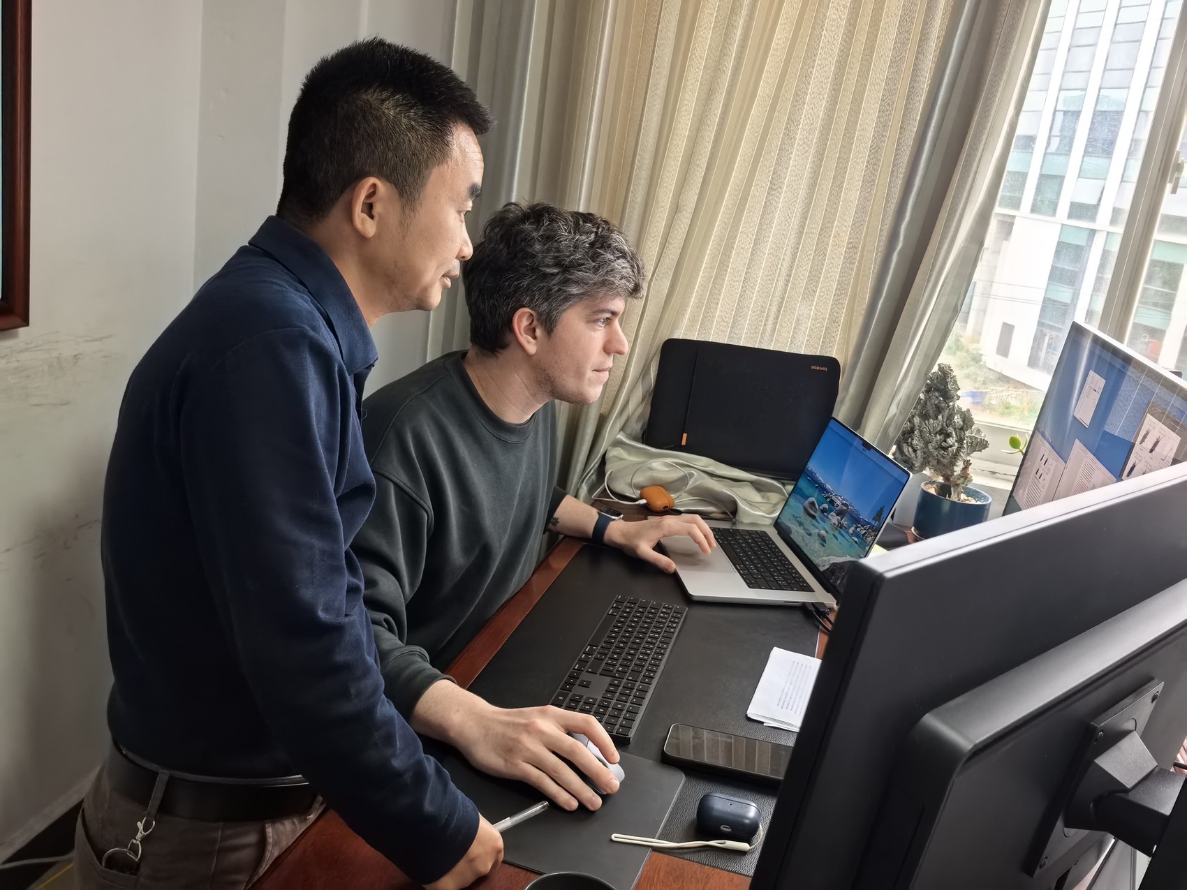 唐晓鹿(左)与团队成员分析数据。受访者供图