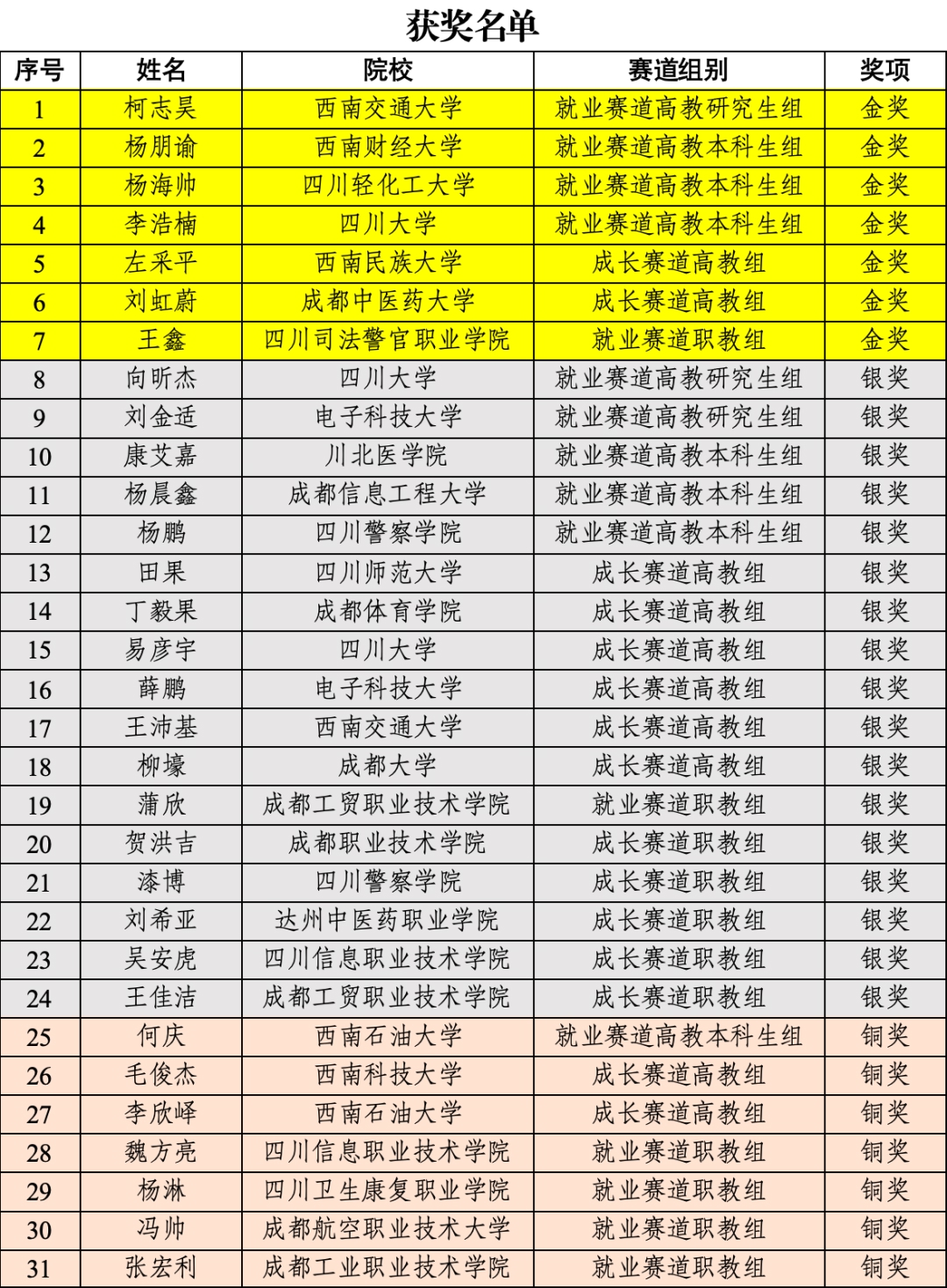 四川在线记者4月27日从省教育厅获悉,近日在天津举办的第三届全国大学生职业规划大赛全国总决赛中,四川高校学子斩获7金、17银、13铜的优异成绩,获奖总数位列全国第四,金奖数量稳居全国前列,实现赛事成绩新突破。成都中医药大学、四川司法警官职业学院、成都工贸职业技术学院获高校优秀组织奖,四川省教育厅荣获地方优秀组织奖。
