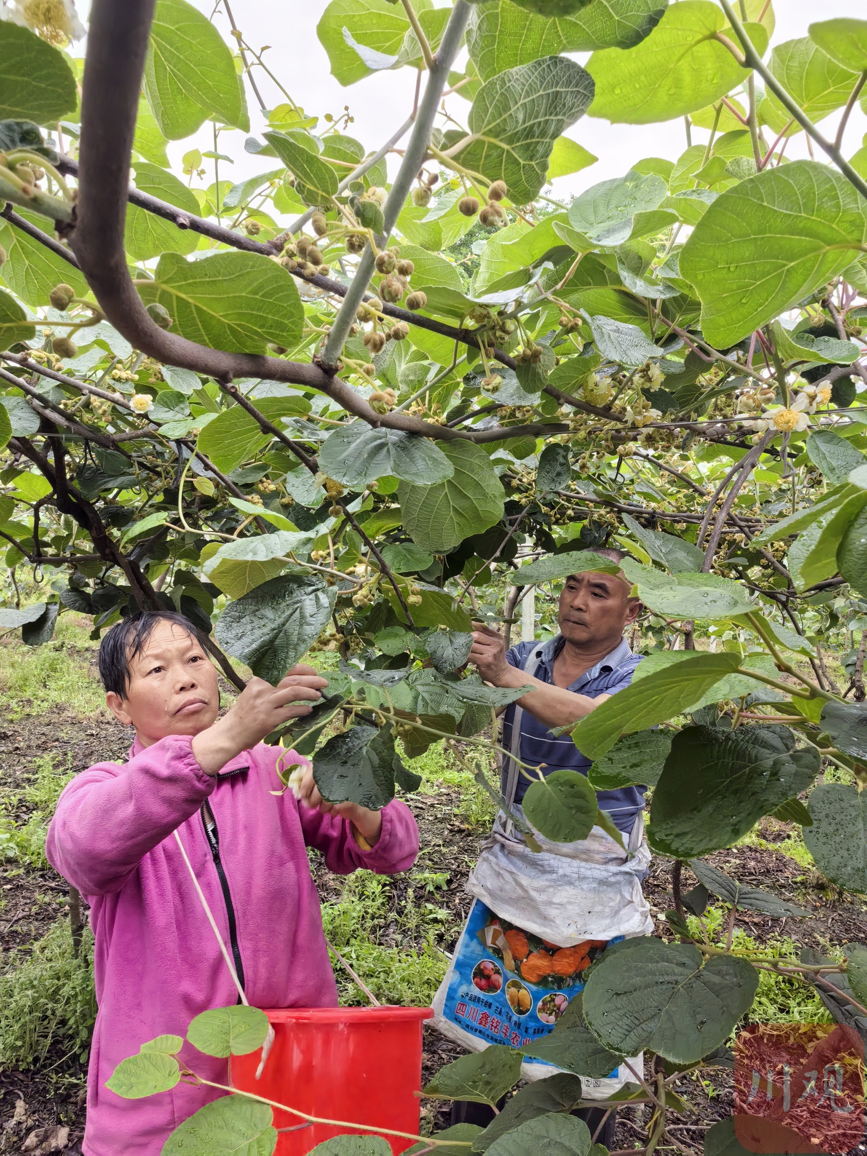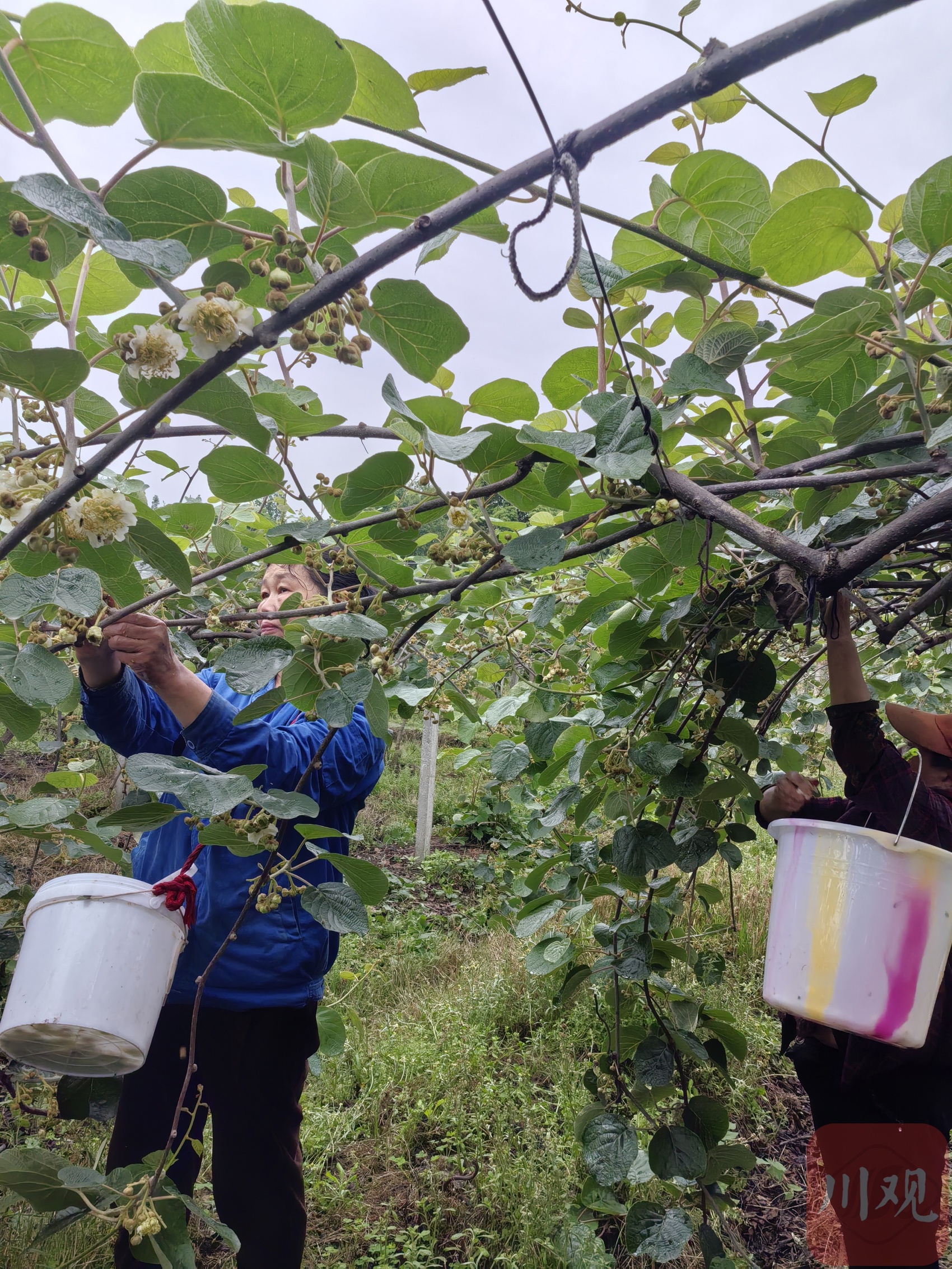 4月27日一大早,位于都江堰市天马镇胥家社区10组的巧玉家庭农场便热闹起来。从早上5时起,袁美君等村民就一直在成林的猕猴桃地里忙碌。这个季节,旁边果园里刚刚挂果的中华系红心猕猴桃才樱桃般大小,距离实施疏果和果实成熟都还早,村民们在忙什么呢?