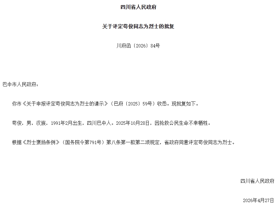 4月28日,四川省人民政府官网发布了关于评定苟俊同志为烈士的批复。
