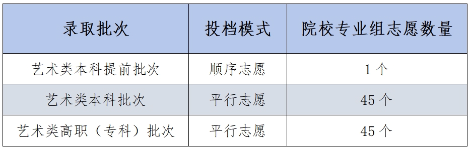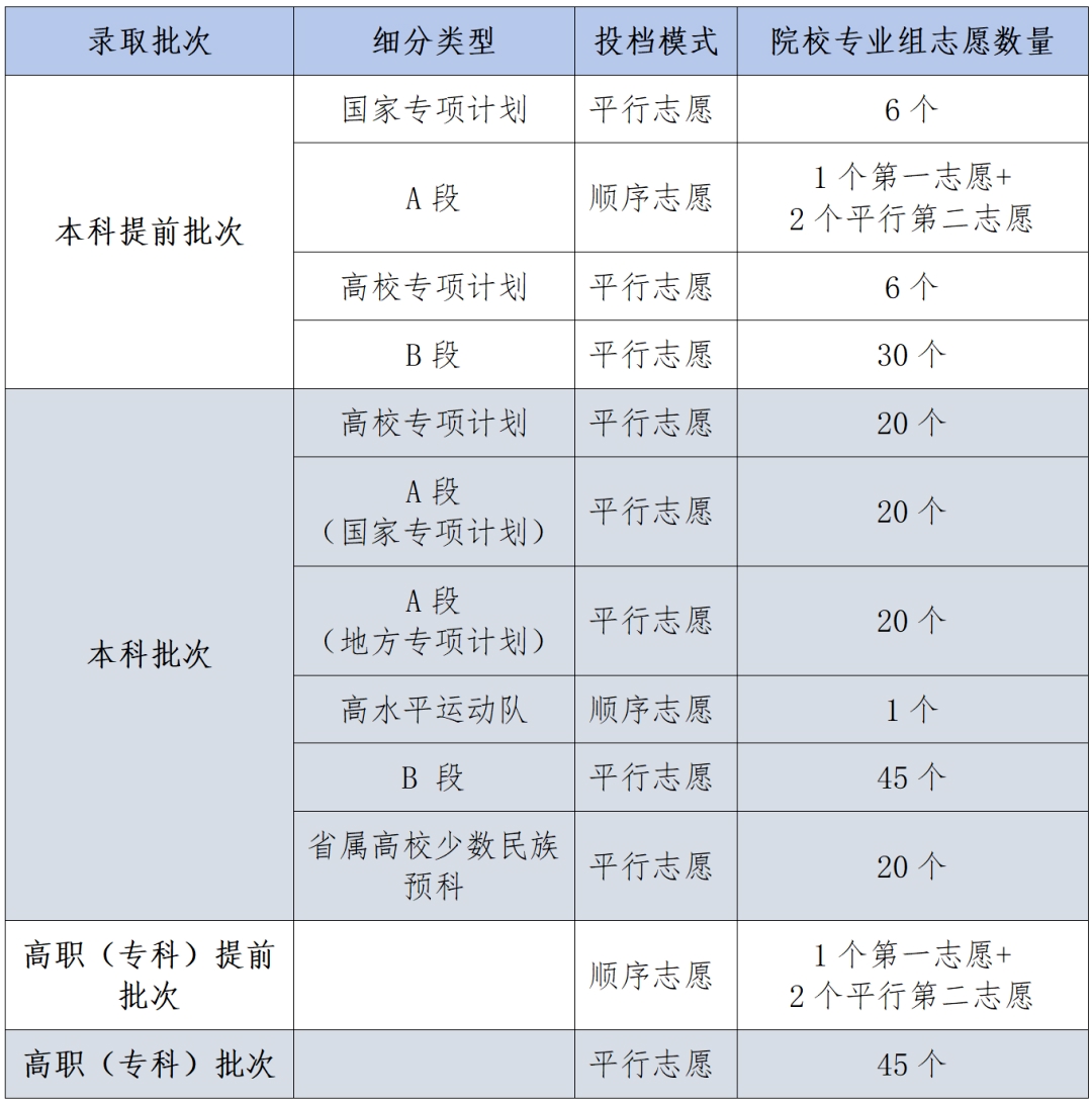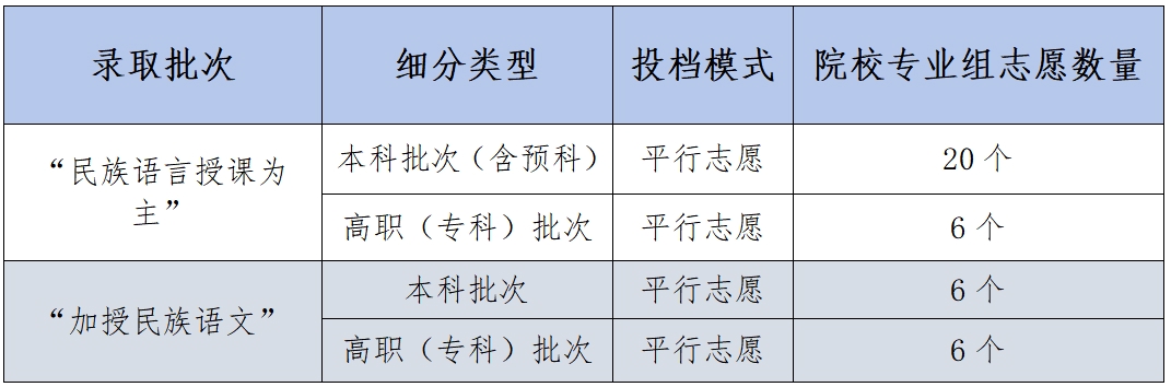 艺术类、体育类、“民族语言授课为主”和“加授民族语文”批次及志愿设置没有变化。