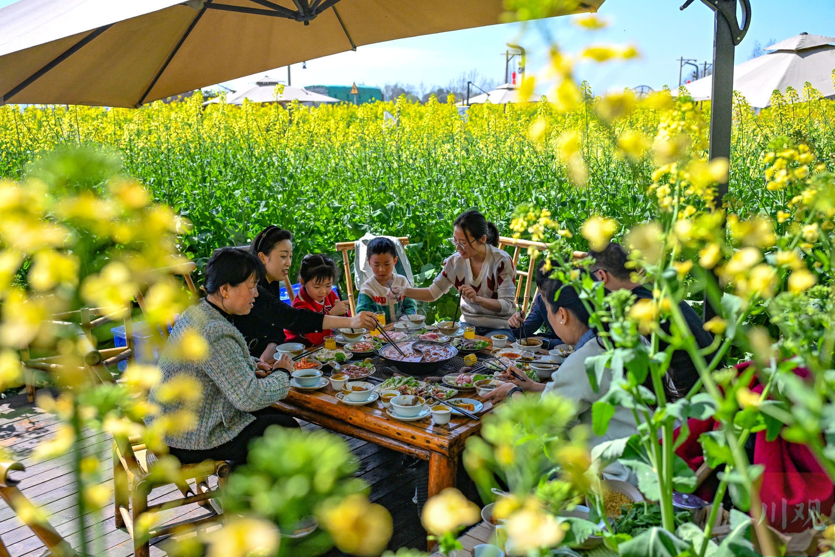 位于成都市新津区的天府农博园内,游客在花海中品尝“花田火锅”。李向雨 摄