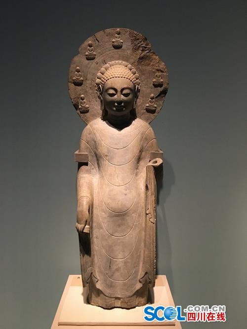 西魏攻取蜀地之后,曾将益州高僧50人迁入长安。此次展览可以看到,成都商业街等地出土的饰满璎珞的菩萨像,肢体轻盈灵动;到了长安,这种饰璎珞的菩萨圆雕像也一脉相承。而在南北两大文化板块之间的山东青州,北魏至东魏早期的造像体现出南朝“秀骨清像”“褒衣博带”的特征。自东魏晚期起,轻薄叠褶服饰的造像则开始兴起,最终发展出具有地方特色的“青州样式”。亮相展览的14件青州龙兴寺出土造像,一改“秀骨清像”的审美,形成面型丰颐、衣纹简洁的薄衣佛像风格。它们也成为整个南北朝时期,汉式佛像艺术与印度笈多艺术完整融合的代表。