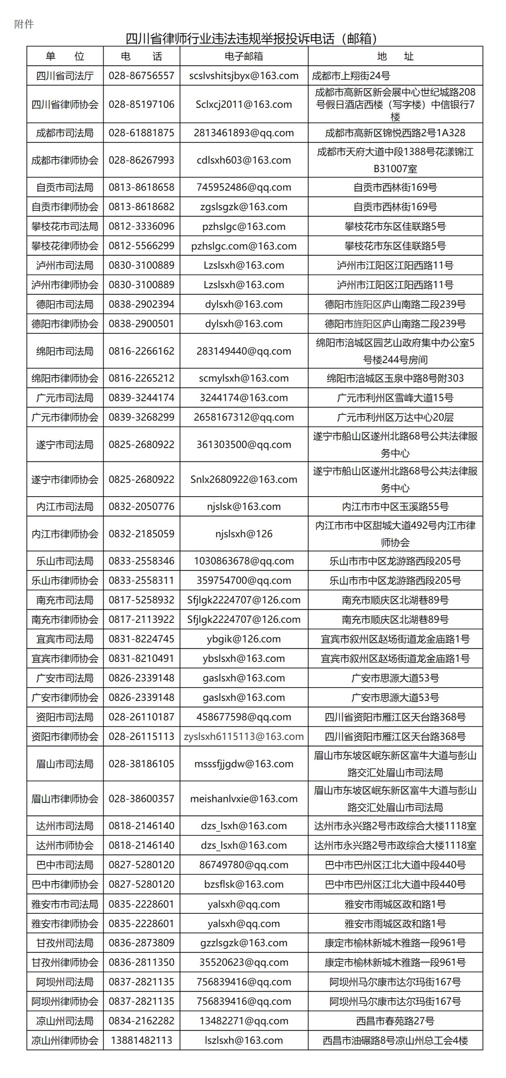 为全面贯彻落实司法部关于开展律师行业突出问题专项治理重大决策部署,日前我省向社会公布省司法厅、省律师协会及21个市(州)司法局、市(州)律师协会举报投诉电话和电子邮箱。对于来访、来电以及来信,属于受理范围的,将按相关法律规定的程序进行办理,不属于受理范围的,将按相关规定交由有关部门处理。据悉,来访、来电受理时间为法定工作日工作时间段。