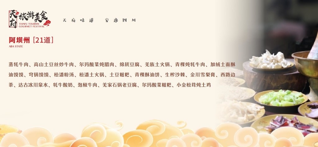 “熊猫家园·净土阿坝”。种类繁多的物产为世代生活在这里的藏羌回汉各族同胞提供了丰富的食材,高山河谷、森林茂密,优越的地理条件,让这里盛产冬虫夏草、松茸、贝母等名贵食材,以及金川雪梨、小金苹果等优质水果,同样盛产水果和蔬菜还有汶川、理县和茂县,而在这些农区的羌族和嘉绒藏族厨房悬挂的香猪腿、腊肠等格式腊肉则有了源远流长的味道,当然还少不了松潘古城的回族美食以及九寨沟、黑水的特色菜品,更难忘怀的是草地牧区阿坝县、若尔盖县、红原县、壤塘县的那原汁原味的藏餐。