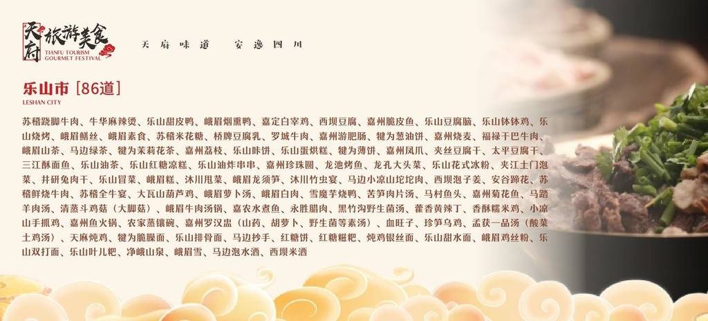 乐山味道承袭了川菜精髓,在四川美食之林中独树一帜,玉嫩似髓的西坝豆腐,老汤沸腾的跷脚牛肉,甜皮酥脆的卤鸭子,质地绵软的雪魔芋……让您的味蕾尽享舌尖上的乐山。“食在四川·味在乐山”,嘉州风情,乐山味道,期待与您邂逅。