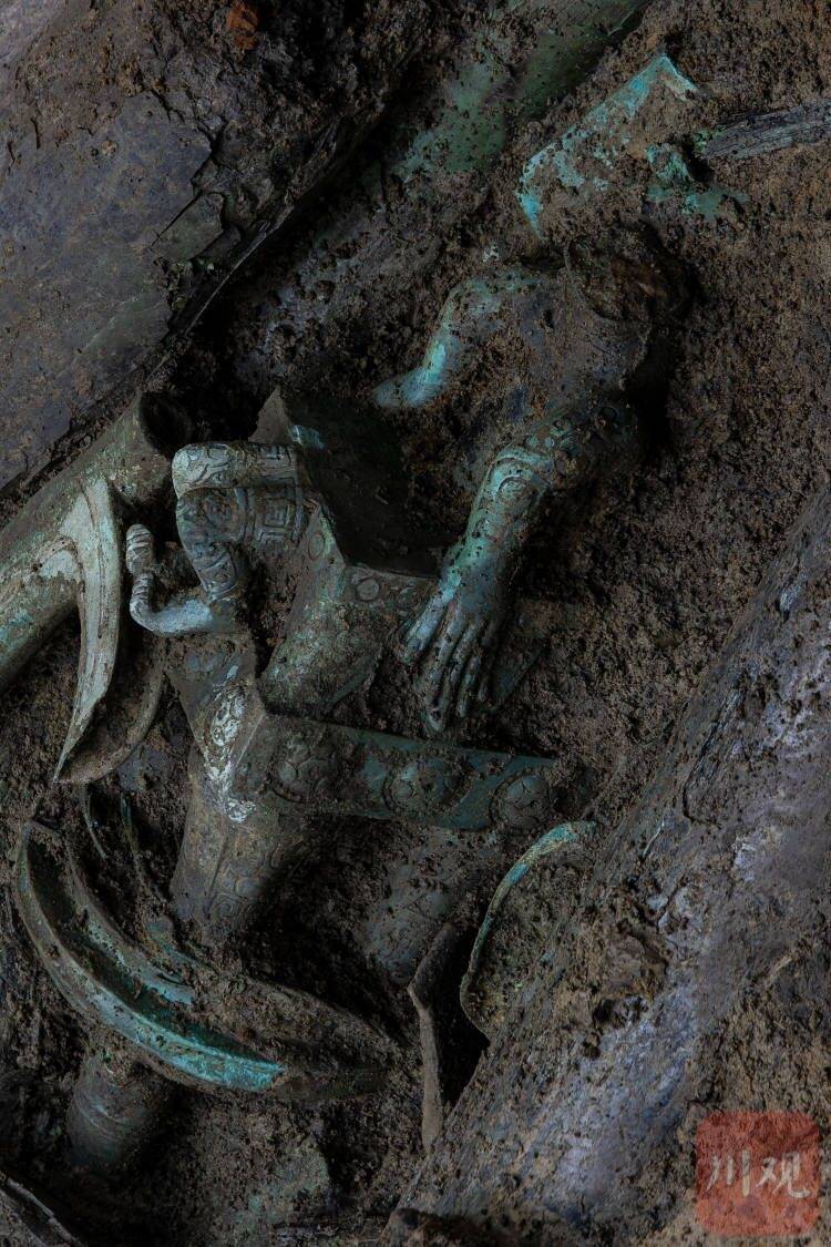 这件“奇奇怪怪”的文物,3号坑坑长杨镇推测应该是一件组合器的一部分,“它可能有一种祭祀的意义,展示了神界和人间的沟通。那件‘飞天’状的人物,表达的应该就是在神界遨游。”