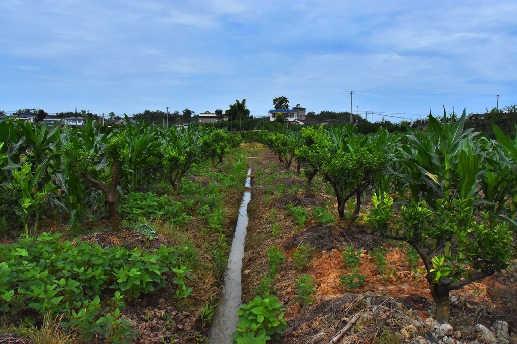 图为丹棱乡村,已套种了粮食作物的幼苗柑橘园