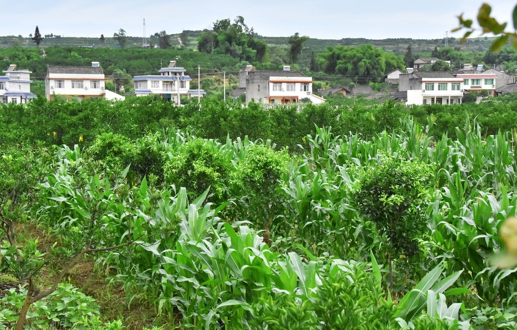 图为丹棱乡村,已套种了玉米的幼苗柑橘园