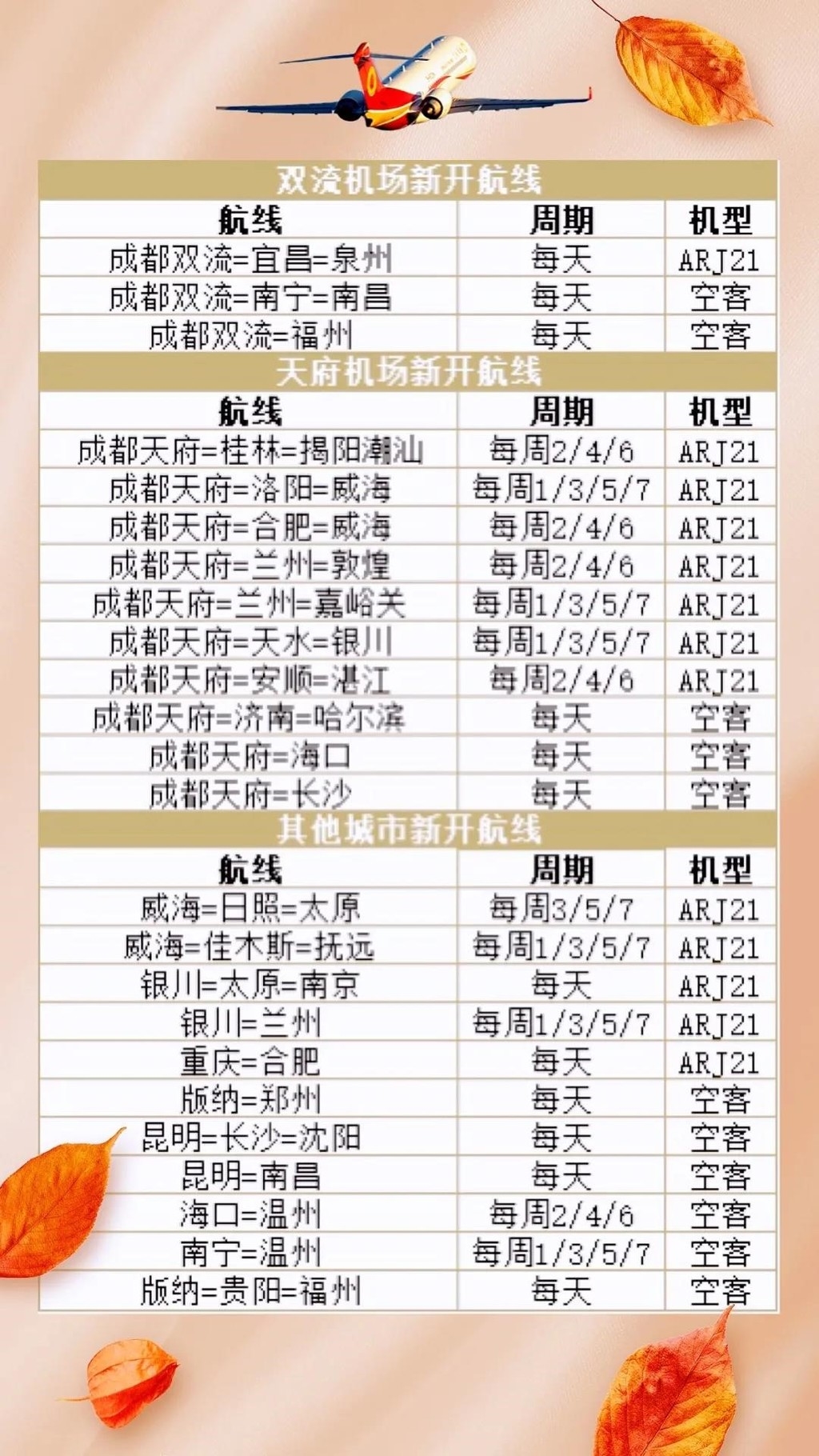 换季后,成都航空将在双流机场新开航线3条。其中,双流=宜昌=泉州航线由中国民机ARJ21执飞,每天一班。在天府机场,成都航空将投入更多运力,新开航线10条,包含了天府=兰州=敦煌、天府=天水=银川、天府=海口等航线。此外,在其他城市,成都航空还将新开重庆=合肥、海口=温州、昆明=南昌等航线。