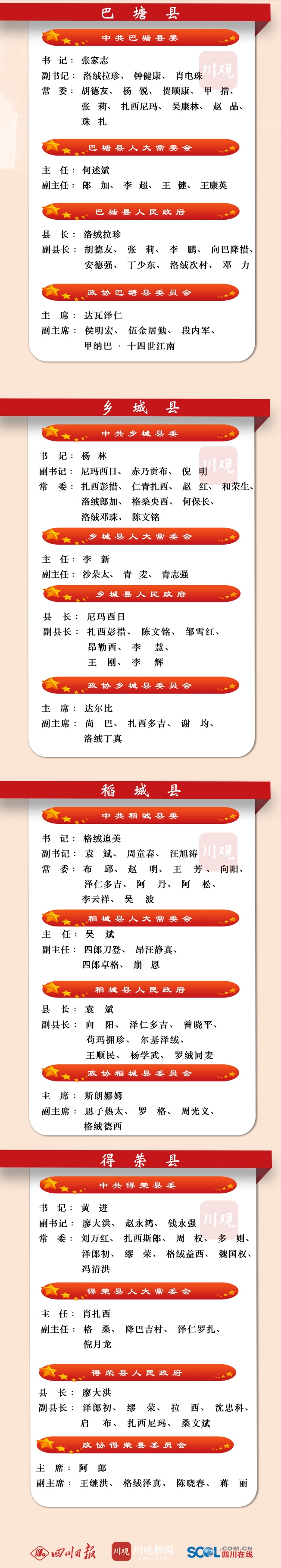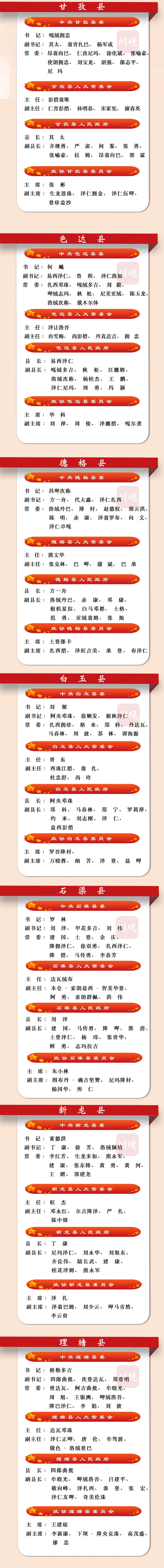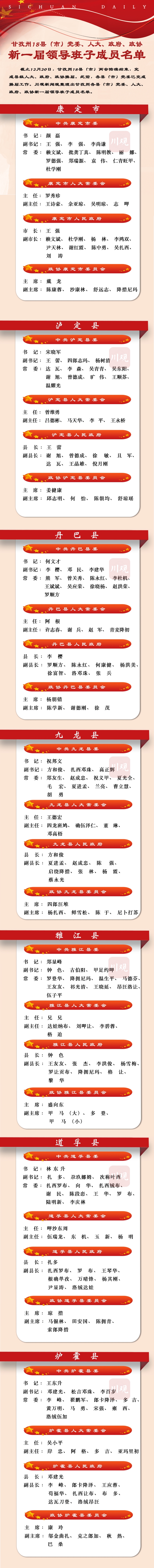 截至2021年12月20日,甘孜州18县(市)两会陆续结束,完成县级人大、政府、政协换届。此前甘孜州18县(市)党委也已完成换届工作。四川在线整理出各县(市)党委、人大、政府、政协新一届领导班子成员名单,一图尽览,欢迎收藏、转发。