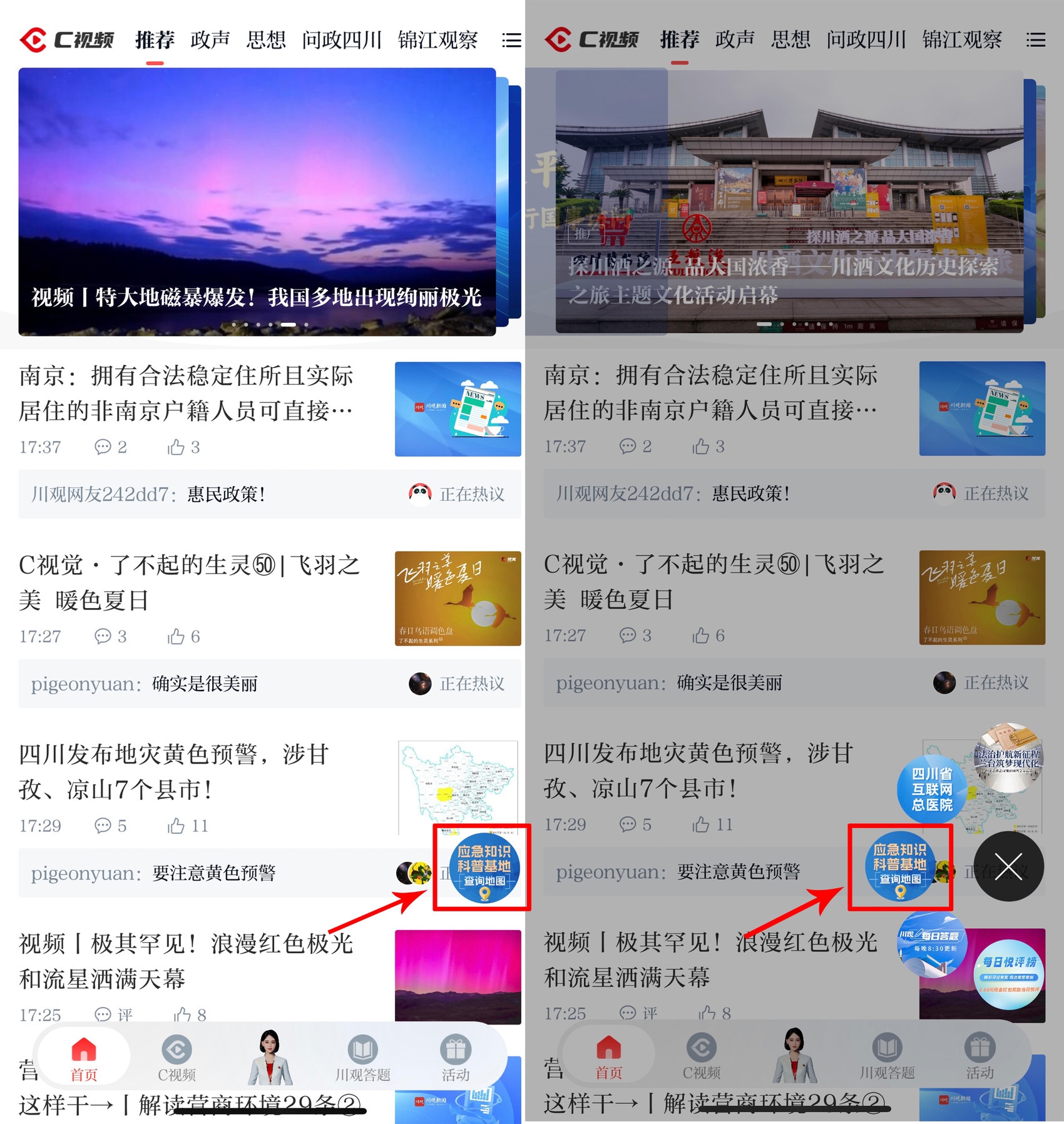 在川观新闻首页,点击右下方悬浮球,找到“应急知识科普基地查询地图”,点击进入活动页面;