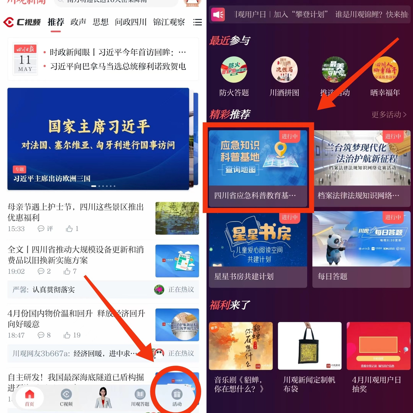 在川观新闻首页,点击右下角活动,找到“应急知识科普基地查询地图”图片,点击参与活动;