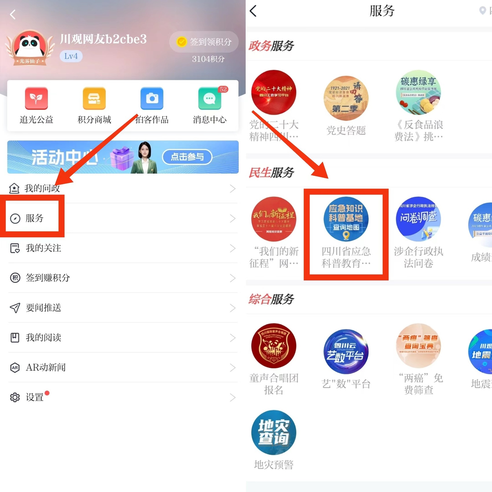 在川观新闻首页,点击右上角“我的”,点击服务,找到“应急知识科普基地查询地图”图片,点击参与;