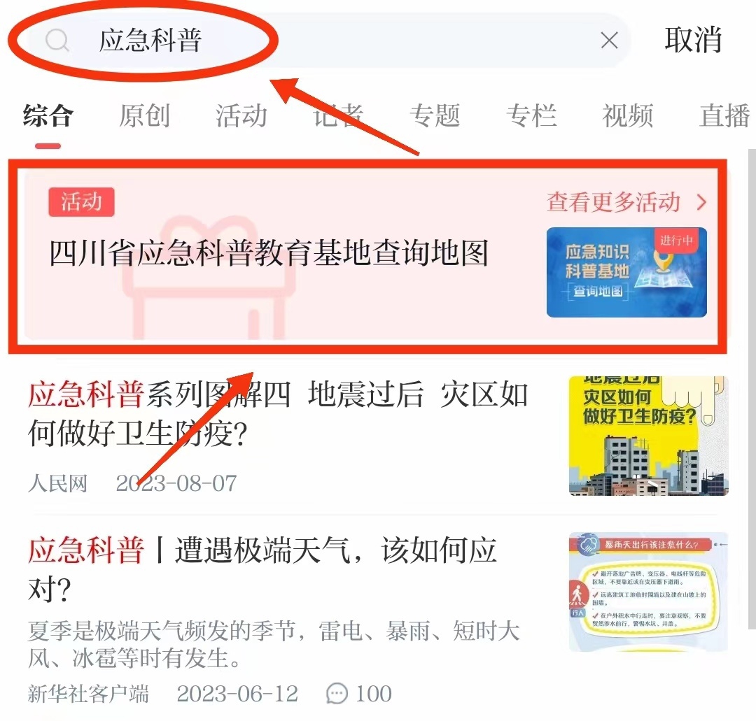 在川观新闻首页顶部搜索框输入“应急科普”,点击活动链接即可参与。