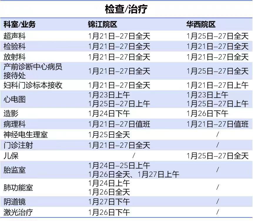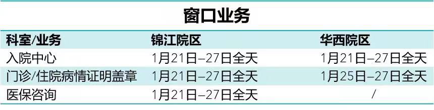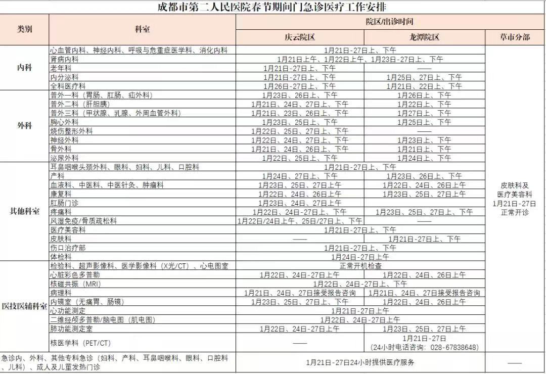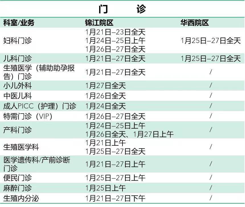 为满足患者节假日就诊需求,医院坚持无休日门诊。春节期间(大年三十至初六)锦江院区儿科、妇科、产科、生殖医学科、医学遗传科等部分专科均有开诊,华西院区大年三十至初三暂停门诊,初四恢复门诊。双院区急诊24小时开诊。门诊及相关业务办理安排如下: