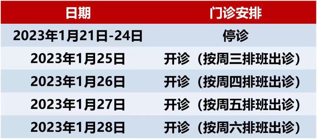 2023年1月21日—2023年1月23日(大年三十至正月初二),1月24日(初三)开始正常接诊
