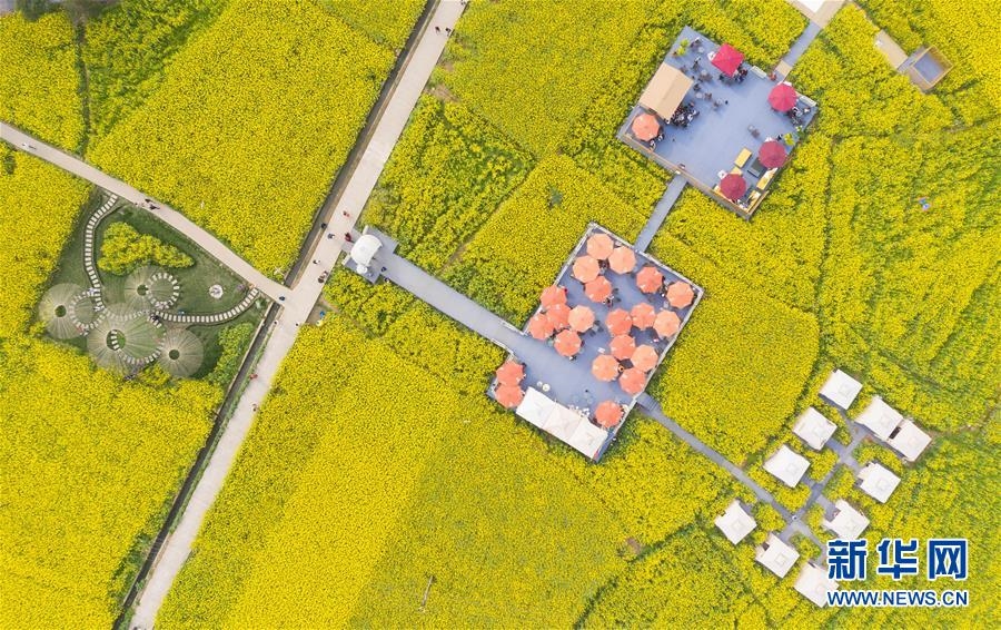 成都崇州市道明镇竹艺村的景观装置和凉棚与油菜花相映成趣(3月20日无人机拍摄)。新华社记者 江宏景 摄