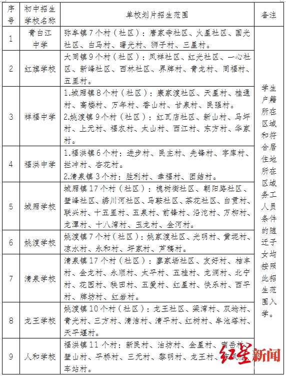 青白江区2020年小升初单校划片招生范围对照表