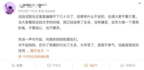 起初,很多人从阿杵的微博发现了不对劲,一封长达千字的“遗书”透露出对所有人的告别:“本来想安安静静一个人走,但是那样莫名其妙失联给大家带来的麻烦太大了,所以我需要解释清楚……”
