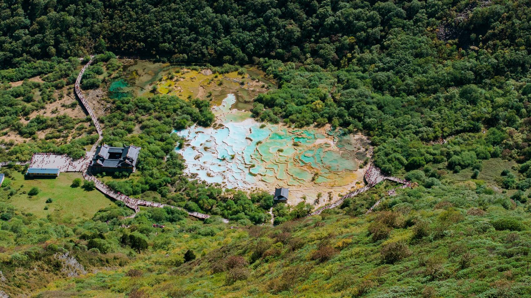 作为世界自然遗产,黄龙拥有世界规模最大、保存最完好的钙华彩池群,长约3.6公里山谷间分布着3400余个钙华彩池,蔚为壮观,也是从上空俯瞰,犹如一条金黄色巨龙盘旋在山谷茂林之间。