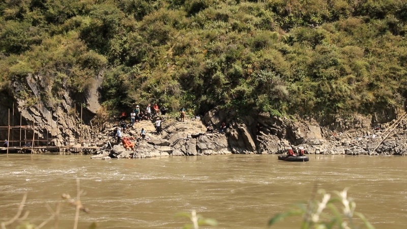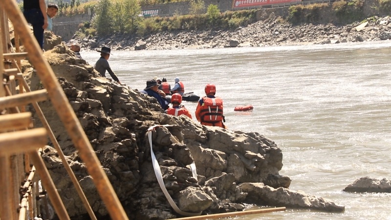 沿着岩石下到长十米左右的竹桥,越过不断卷起漩涡的河水,再攀上一块突出山体的陡峭岩石,便是第二个回水湾。救援人员搜救的重点就在这一区域。“根据当地水文专家和熟悉当地地形的‘土专家’分析,车辆被这个回水湾漩涡卷入河底的可能性更高。”侯正刚说。