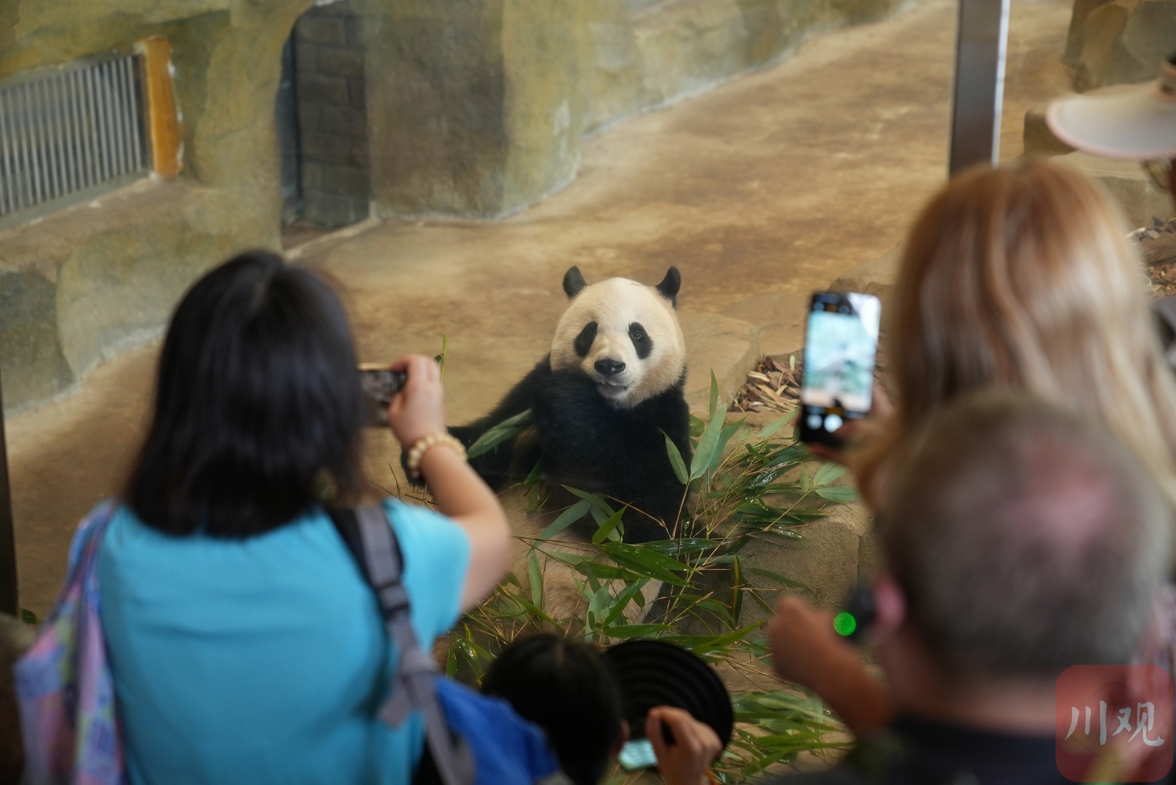 外国媒体人和游客们正争相拍摄吃着竹子的大熊猫。