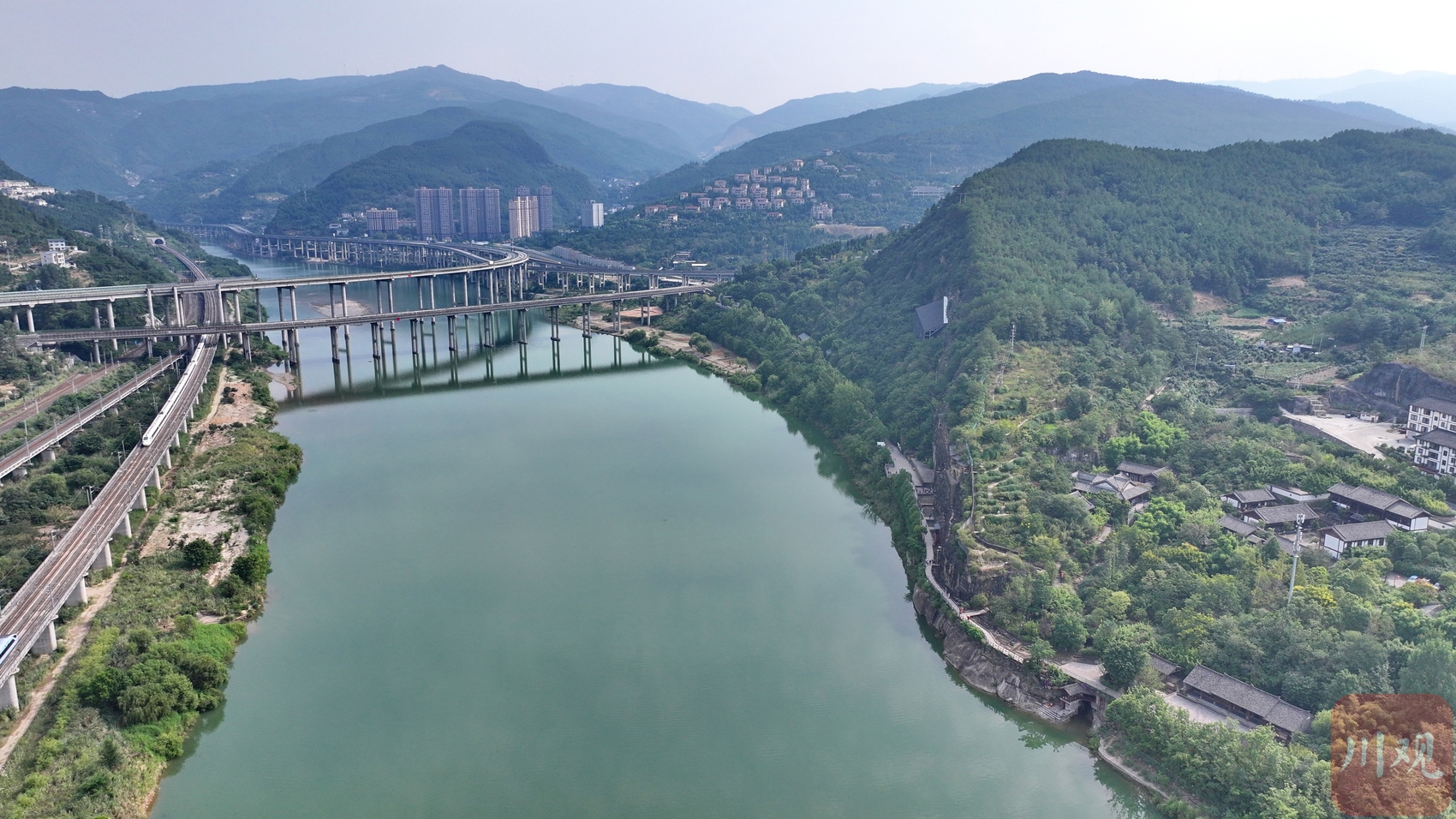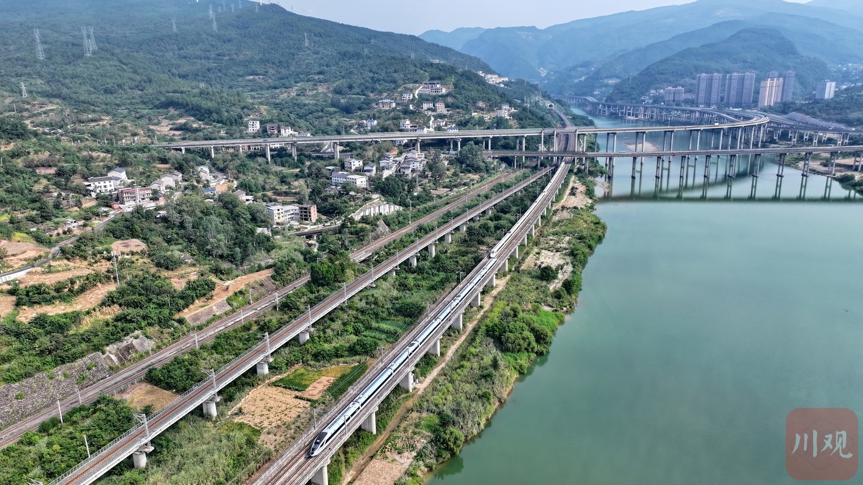 行驶在嘉陵江畔千佛崖对面的高铁。