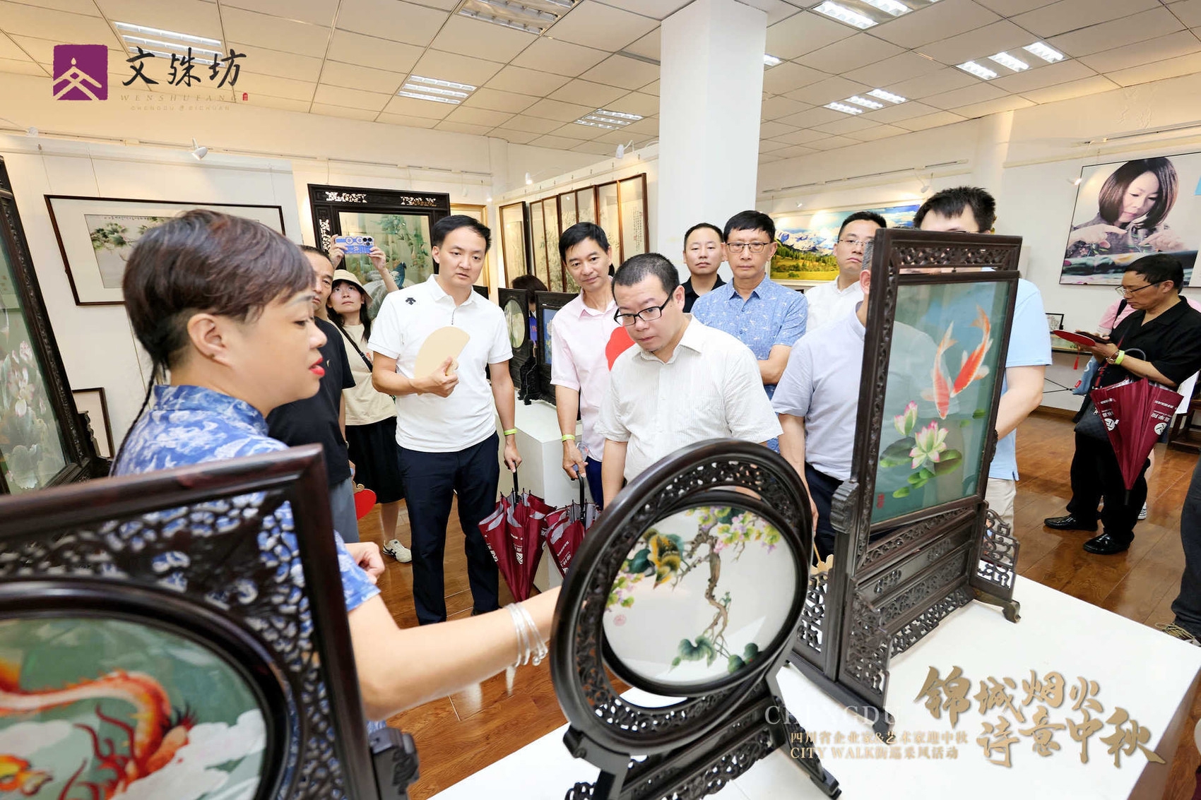 街巡采风环节,企业家与艺术家们从树影掩映中的千年古刹文殊院行至古朴典雅的肇第门楼,还体验了孟德芝非遗蜀绣工作室、刘氏竹编、无形妙有唐卡文化体验馆等特色文化商铺,在文殊坊独有的历史文化韵味中,感受传统文化与现代生活的交融。