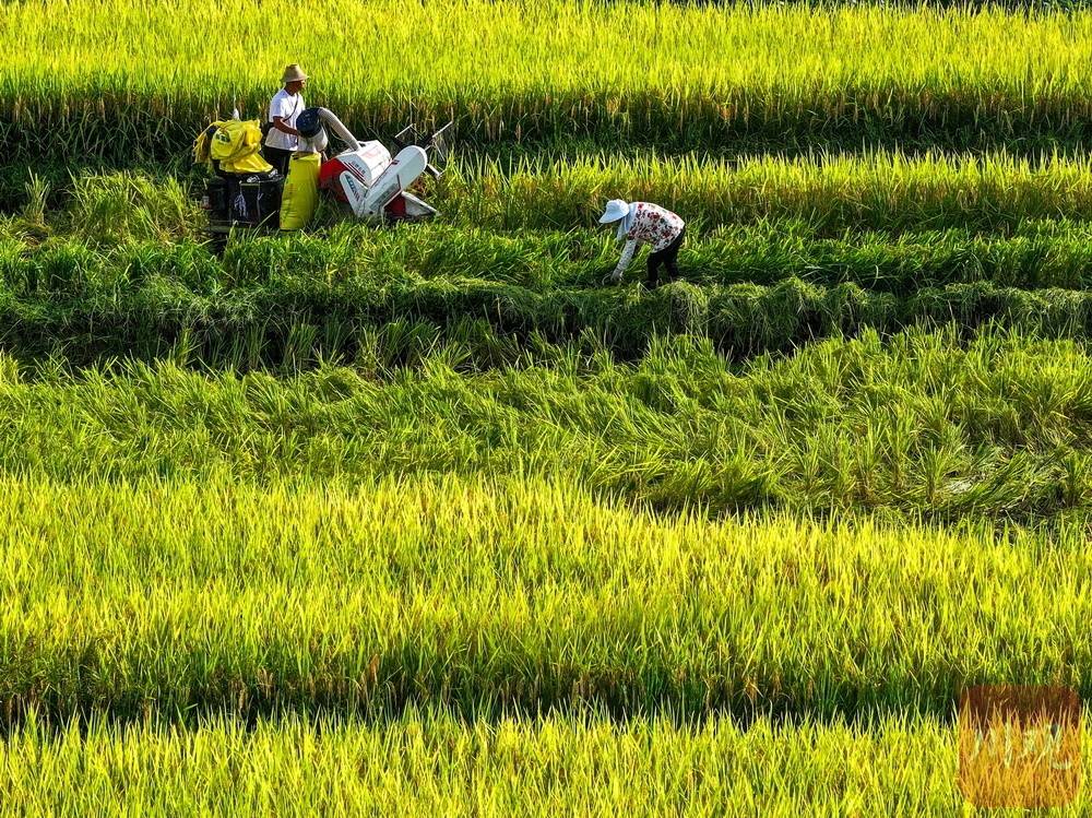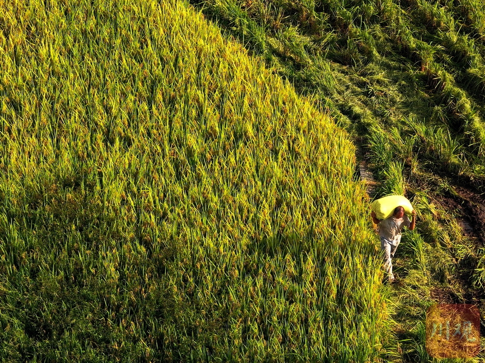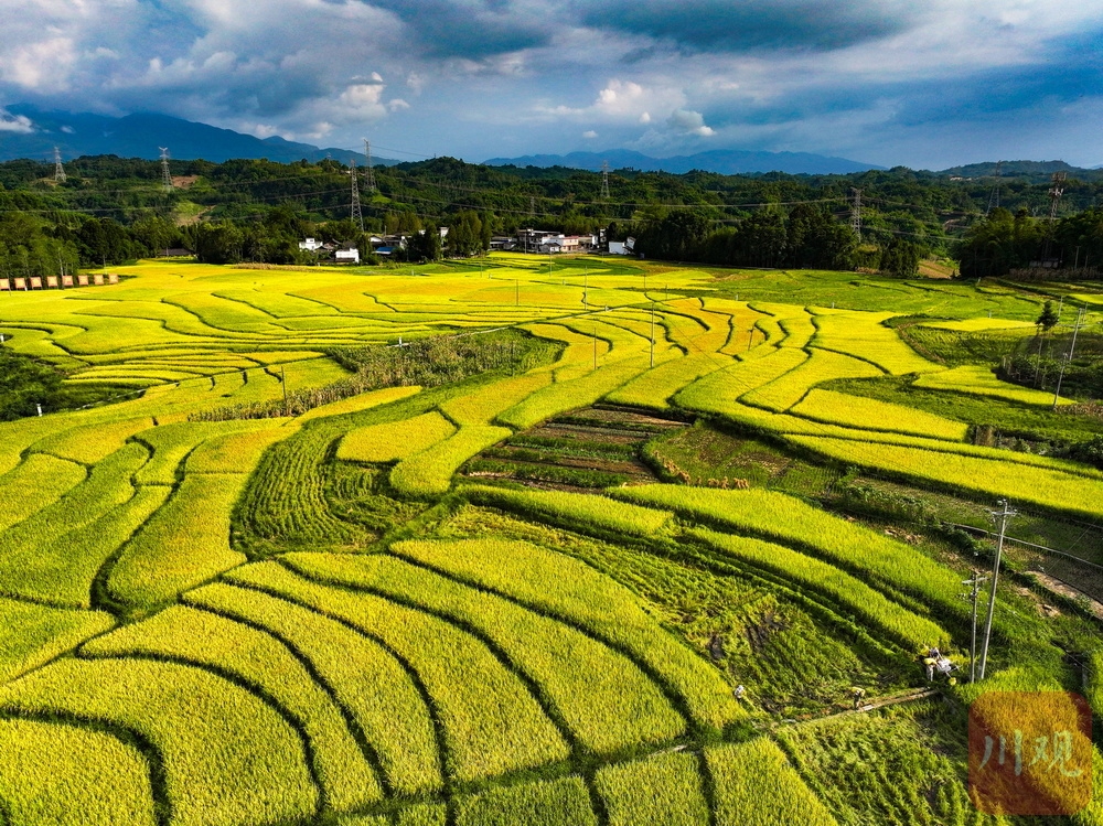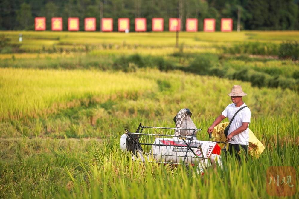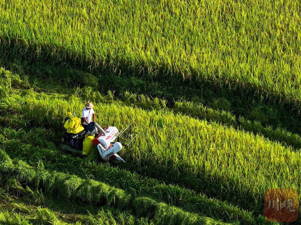 9月9日,走进雅安市天全县仁义镇,九月的稻田满眼金黄,微风中混杂着稻田的清香,村民们正趁着晴好天气收割稻谷,一派丰收景象。