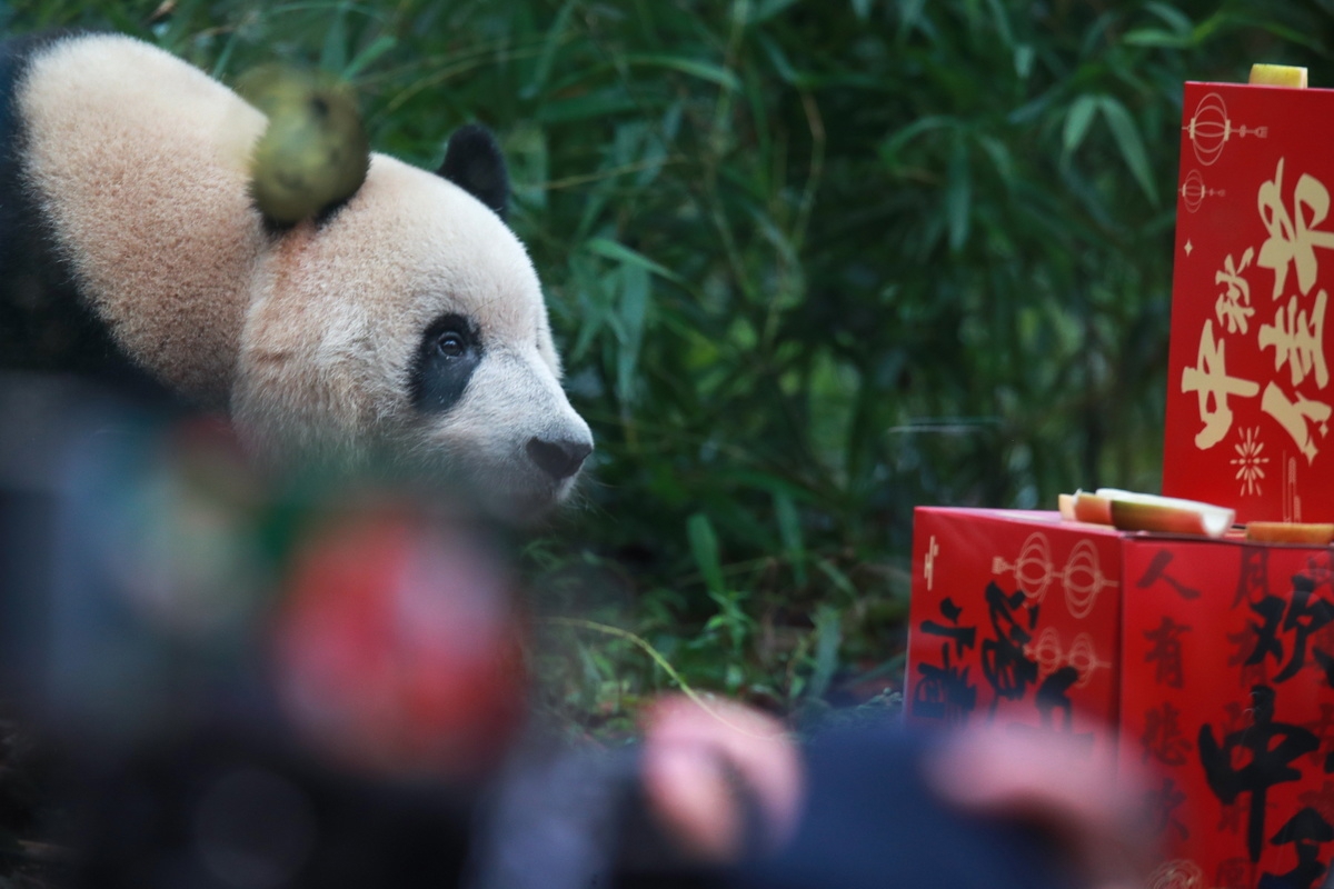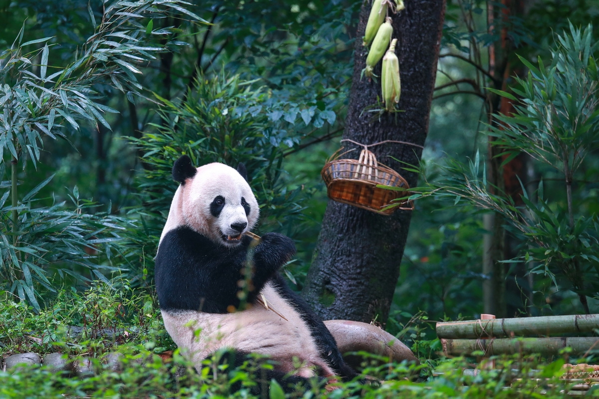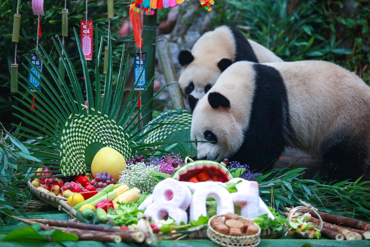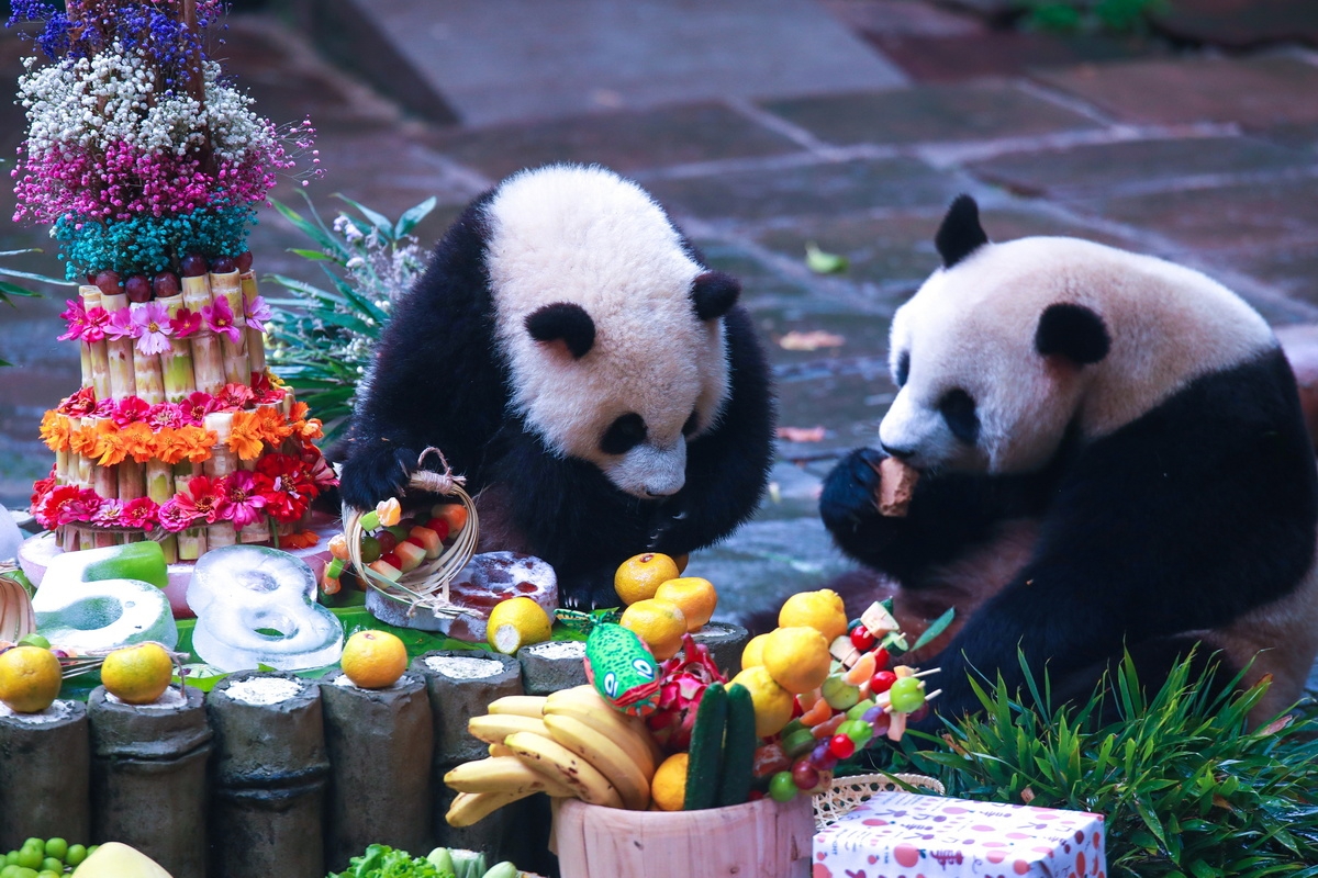 9月13日,中秋将近,居住在中国大熊猫保护研究中心雅安基地的大熊猫们提前吃到了特制的“月饼”。当日,基地为大熊猫们举办了一场集体生日会。