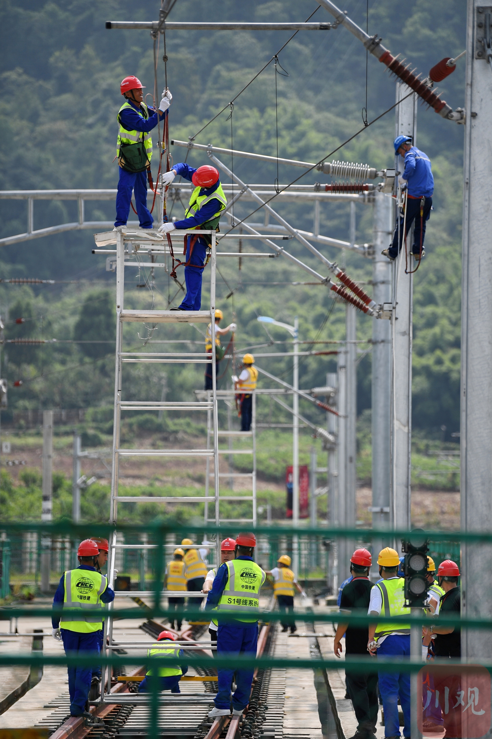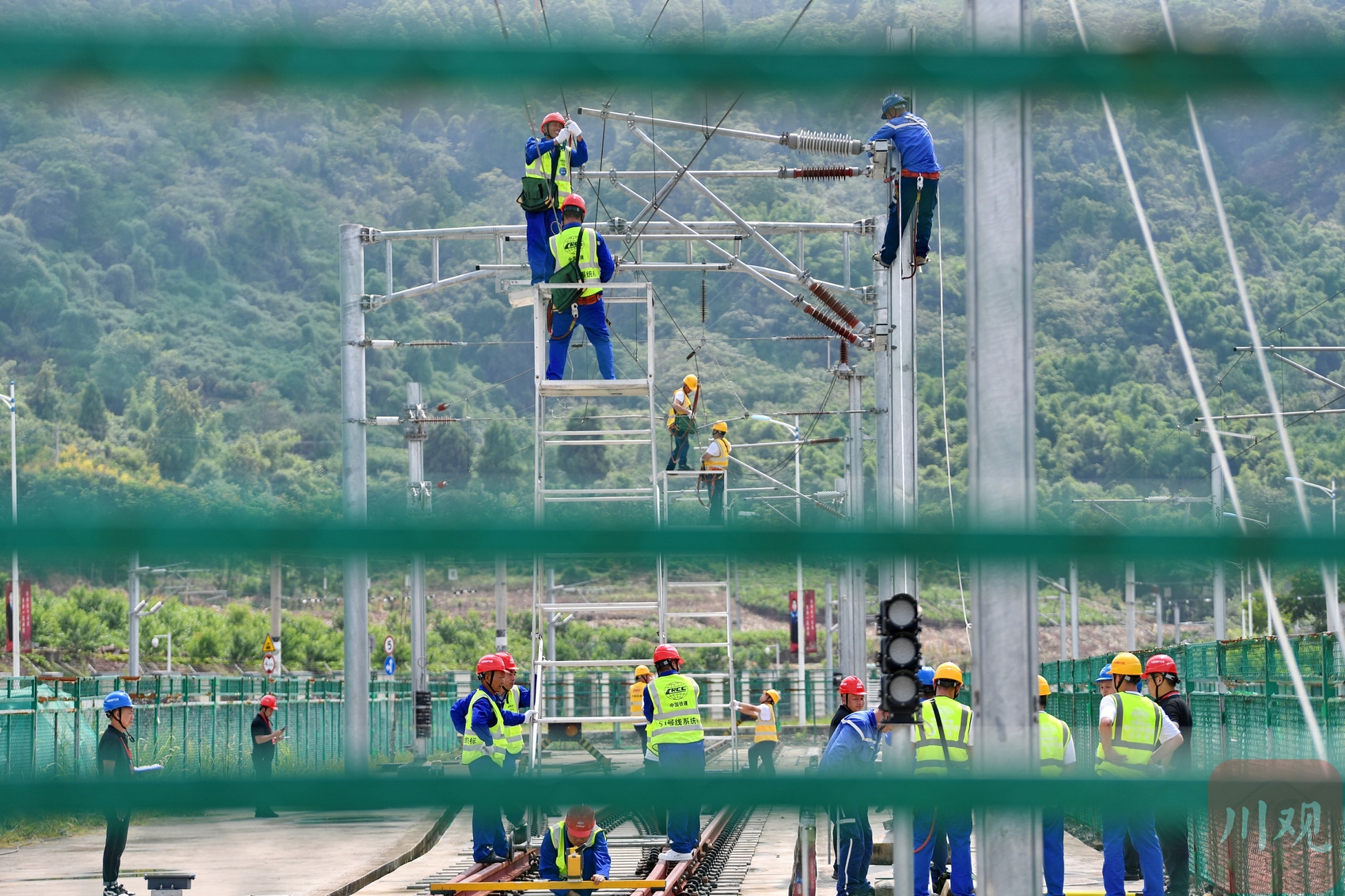 参加“成都百万职工技能大赛之城市轨道交通供电系统职业技能竞赛”的选手正在参加接触网设备比赛。