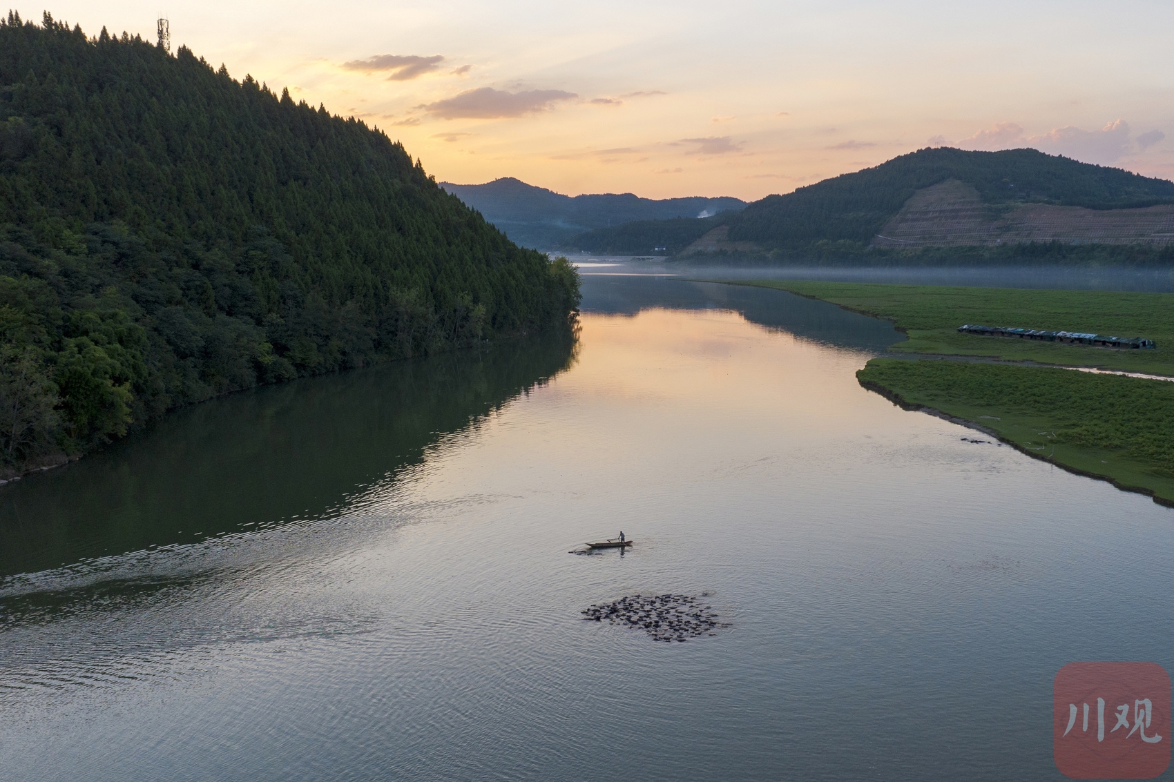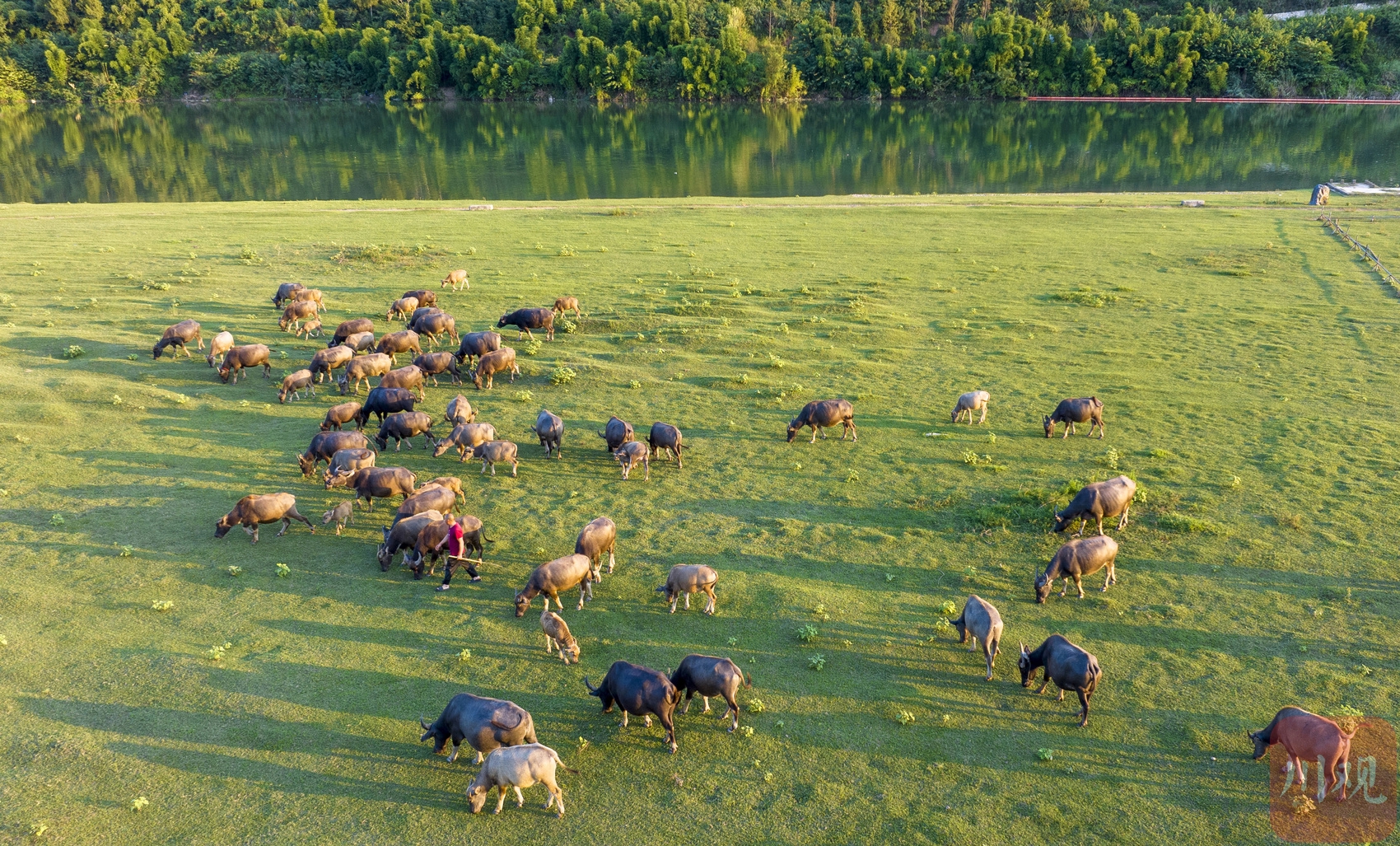 牧归的牛群与夕阳、嘉陵江水等构成一幅美丽的生态画卷。