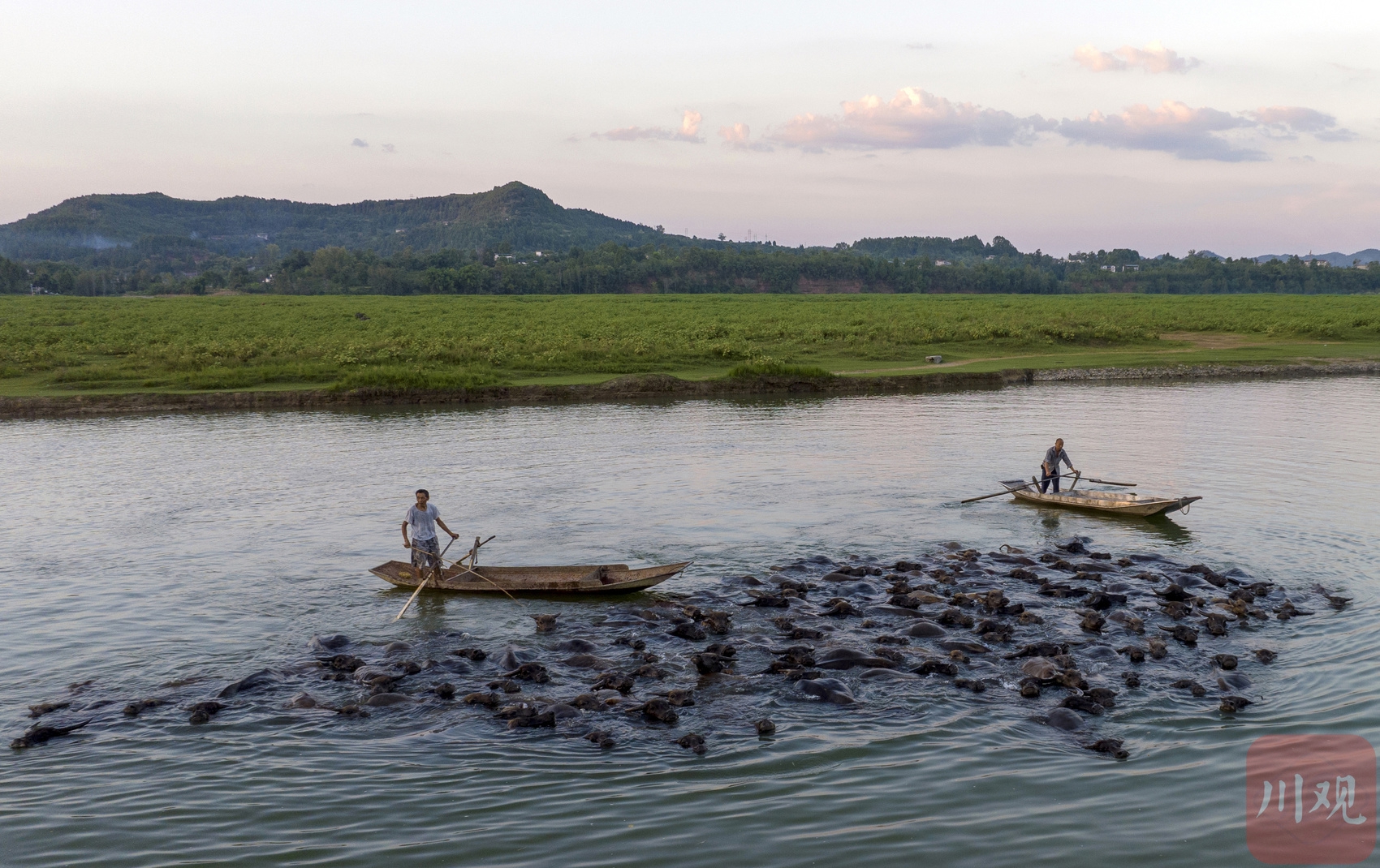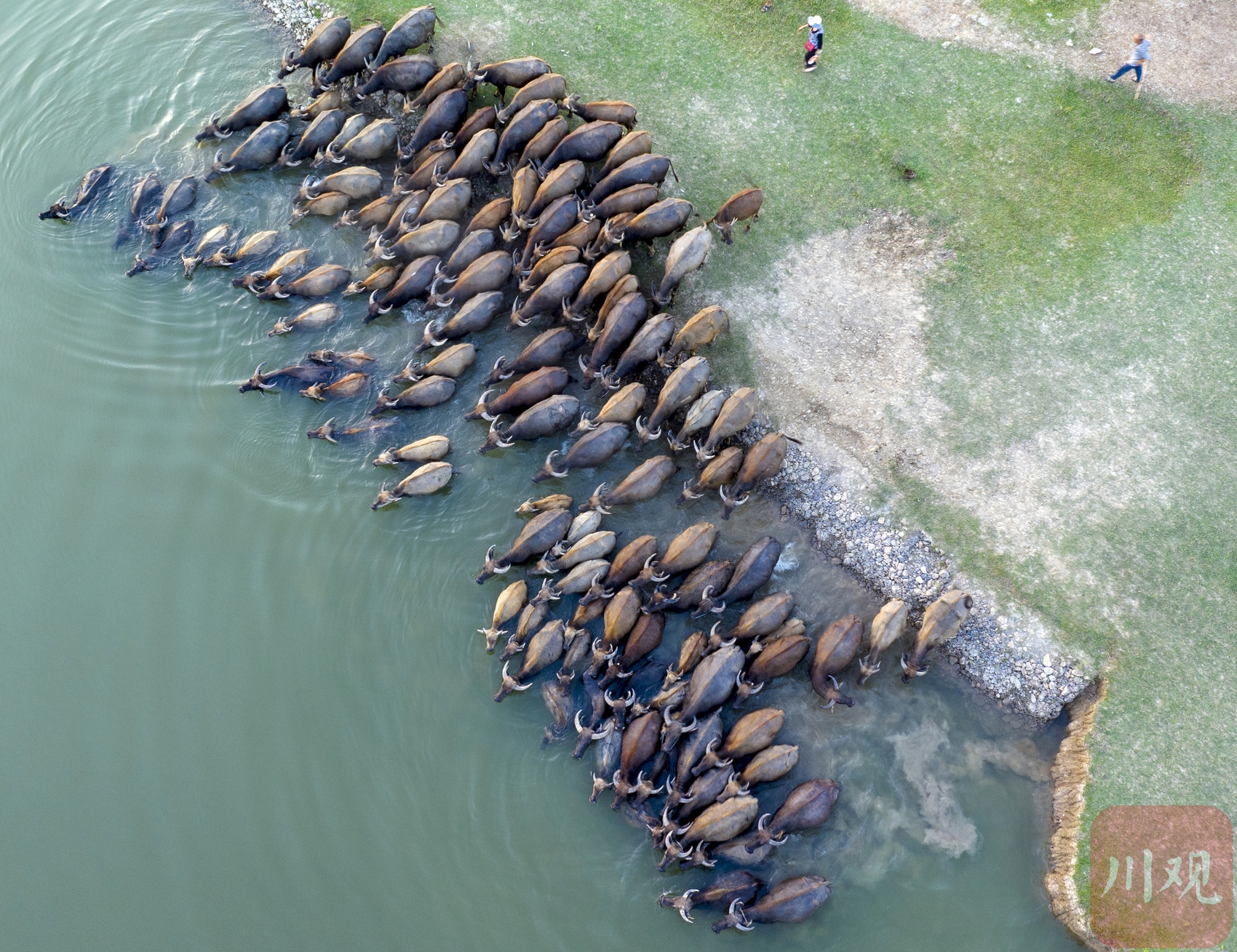 9月17日,南充市蓬安县相如街道油房沟社区的嘉陵江段,牛群向江心岛游去,形成了“百牛渡江”生态奇观,吸引了中秋出游的众多市民游客前来观赏。“百牛渡江”已成为蓬安县嘉陵江上一道靓丽的风景,