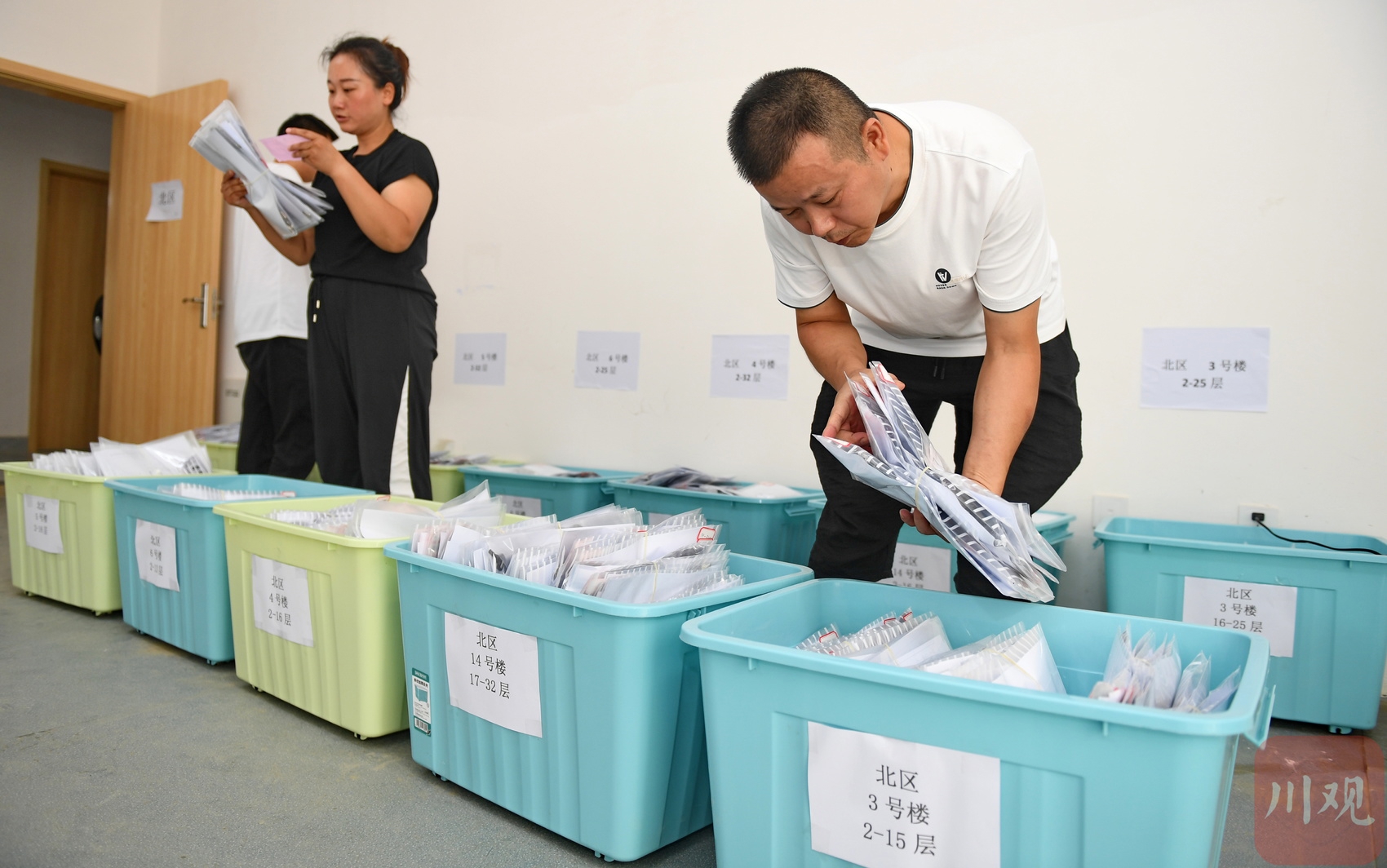 安置房项目工作人员为居民找新房钥匙。
