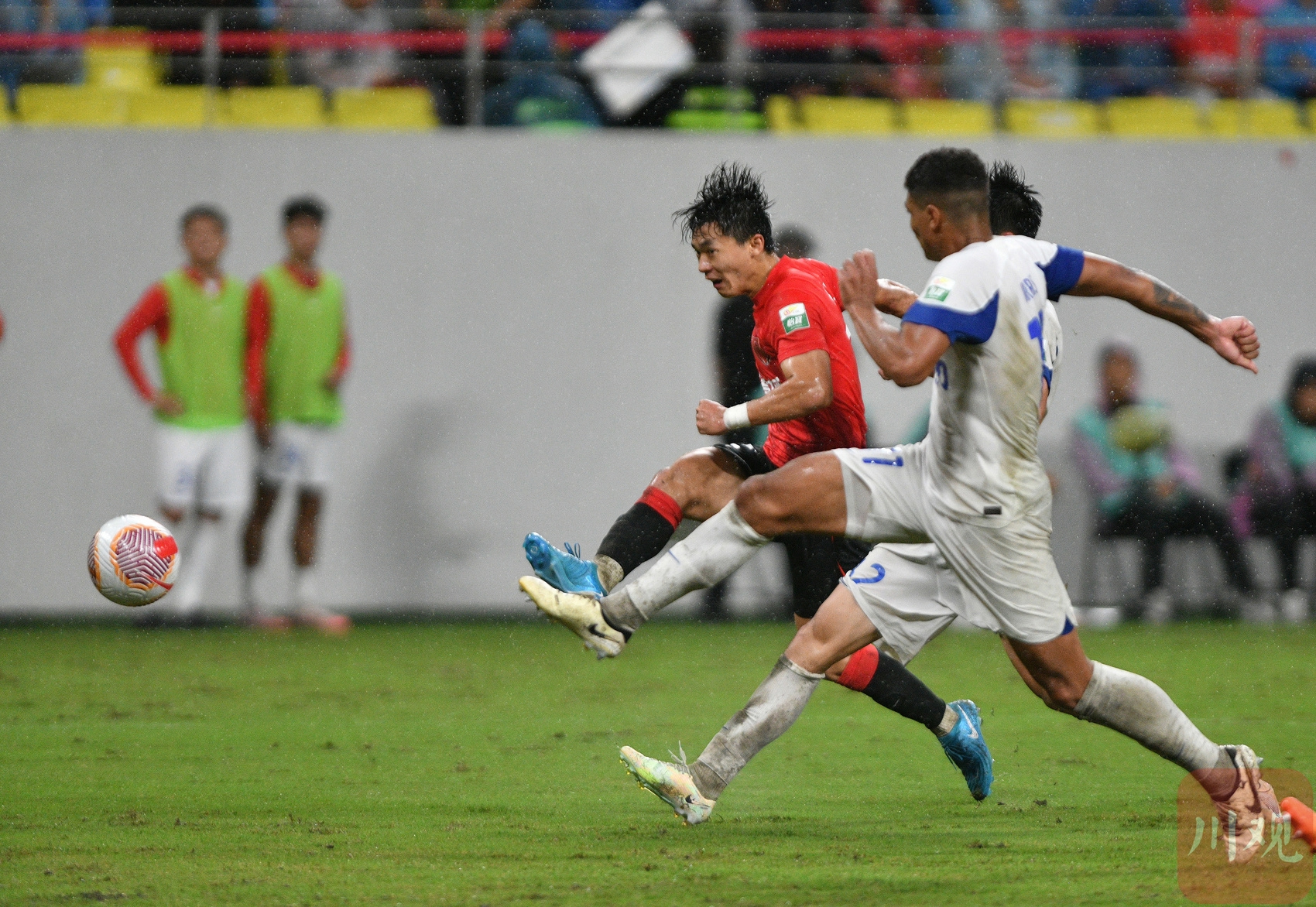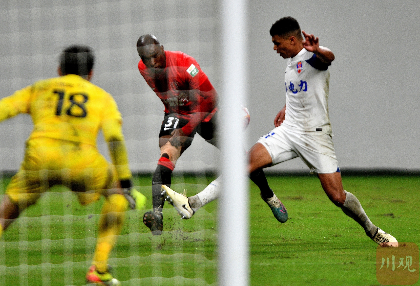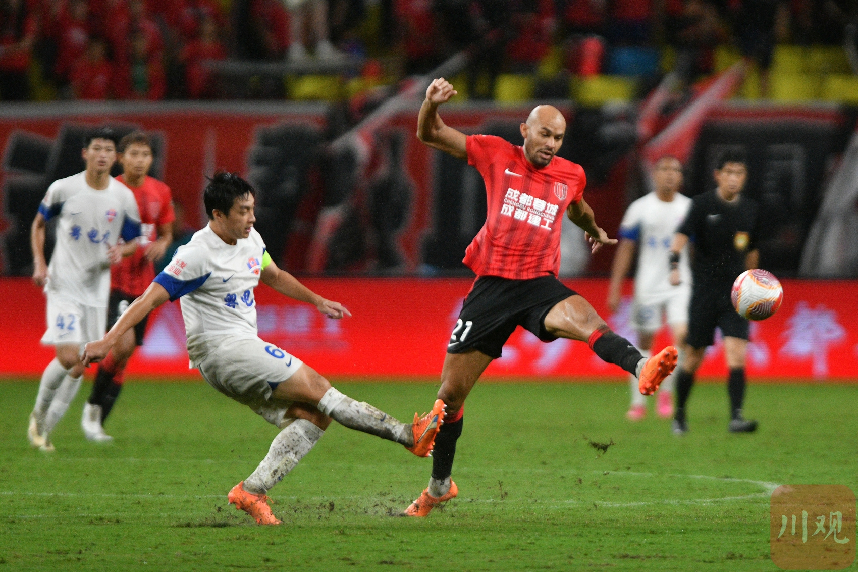 比赛现场成都蓉城队员(红衣)抬脚射门。