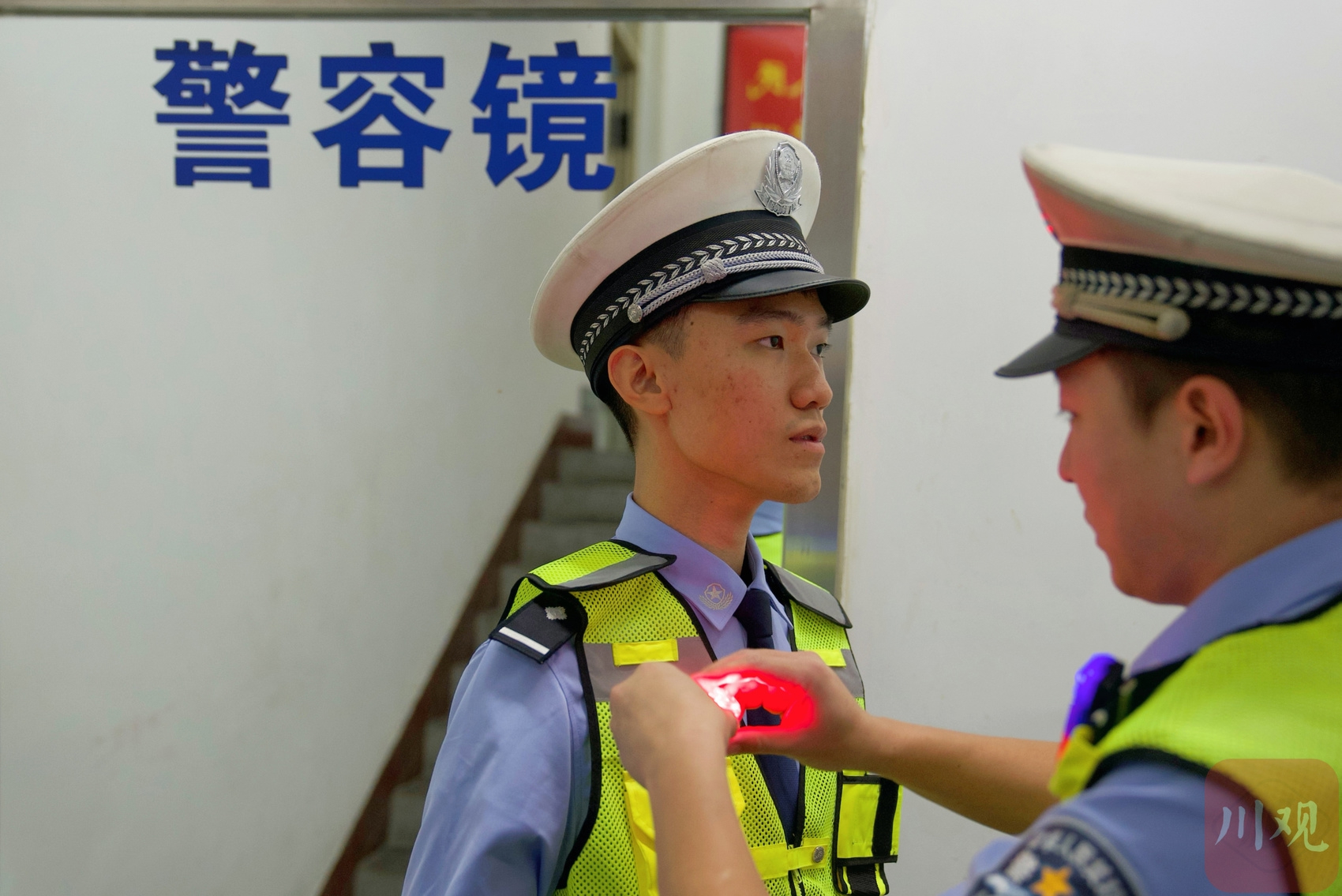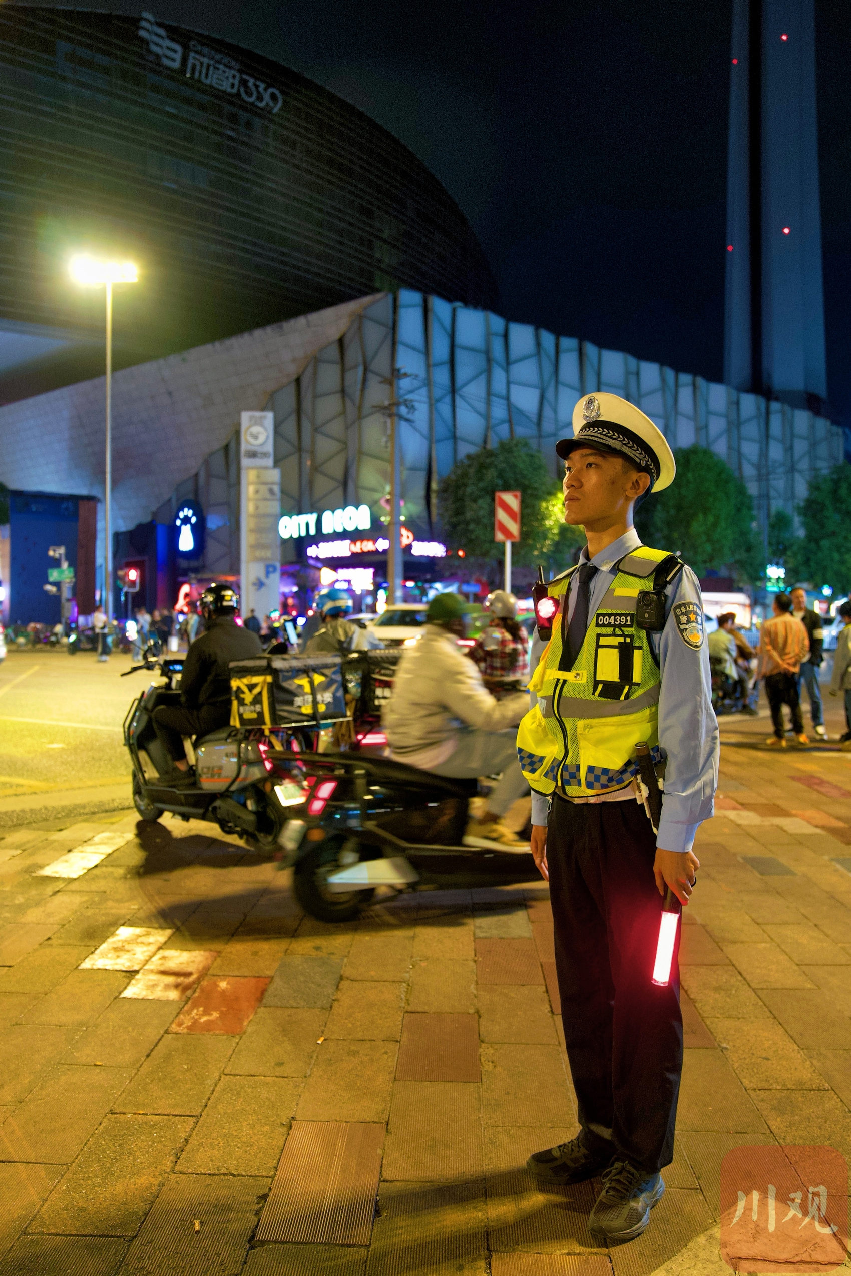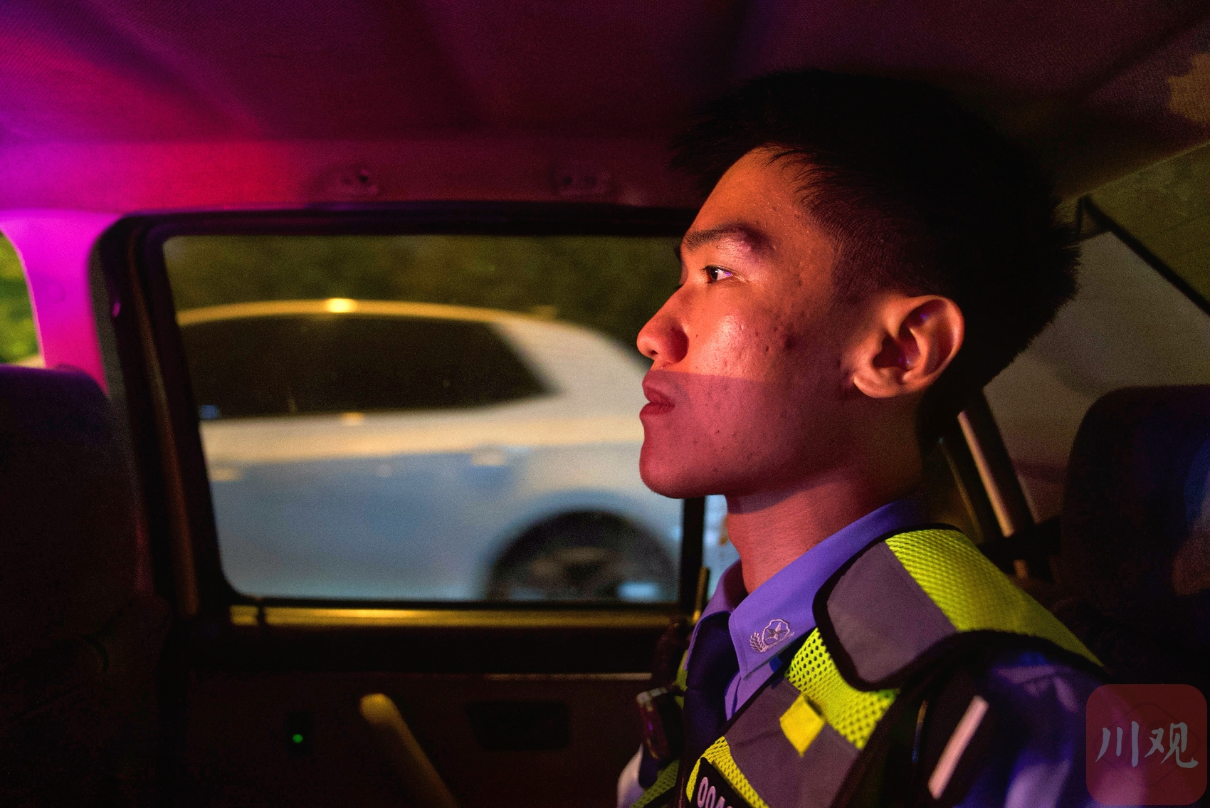 成都市公安局交通管理局第五分局三大队民警唐潮,入警后第一次参与值班夜巡。