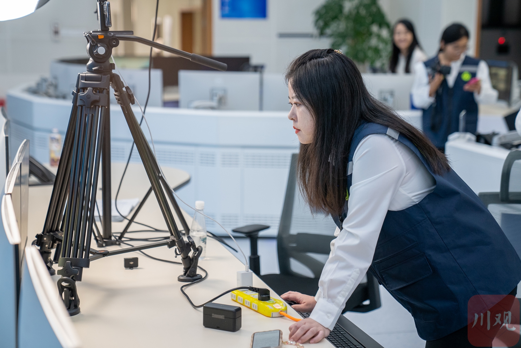 10月5日,四川在线记者来到四川省交通运输运行调度中心,见到了正在进行路况直播的工作人员——洪宇箫。她正站在监控大屏前,与后方配合画面调度的同事们进行直播。直播间里,询问路况的评论快速划过,有网友等到答案就离开直播间,也有网友继续评论分享自己的假期出行经验。