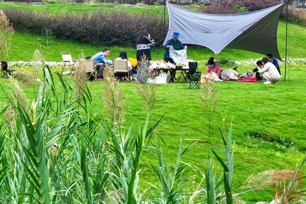 搭帐篷、架天幕、摆餐桌、烤烧烤……10月6日,在雅安市雨城区滨江绿廊文化公园内,不少人在青衣江畔“安营扎寨”,烧烤烹饪,聚会玩乐,享受亲近大自然的闲暇好时光。
