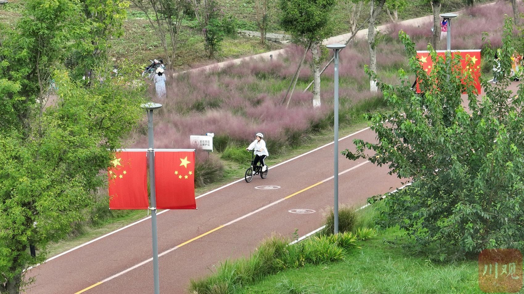 10月7日,市民来到玉石湿地公园,在成片粉黛乱子草组成的粉色“海洋”旁的绿道骑行
