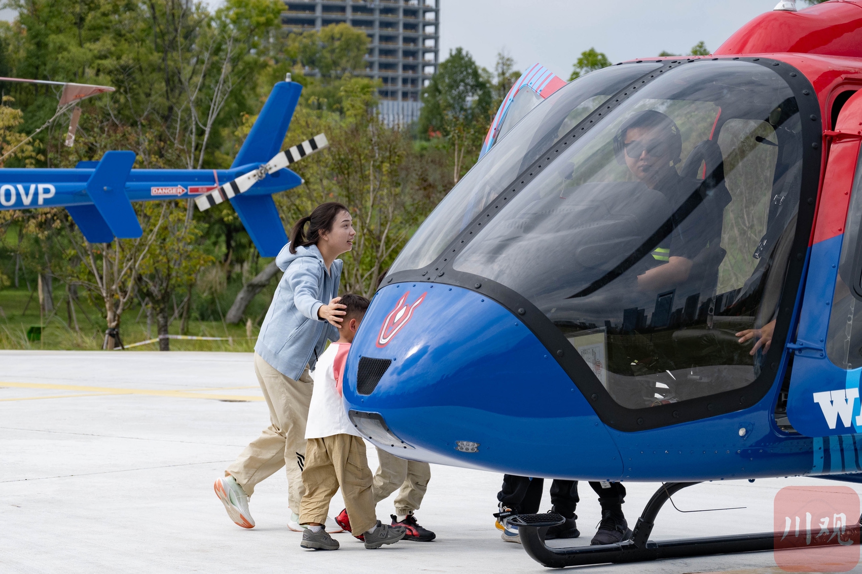 10月7日,民众在天府新区天府公园搭乘直升飞机观光。