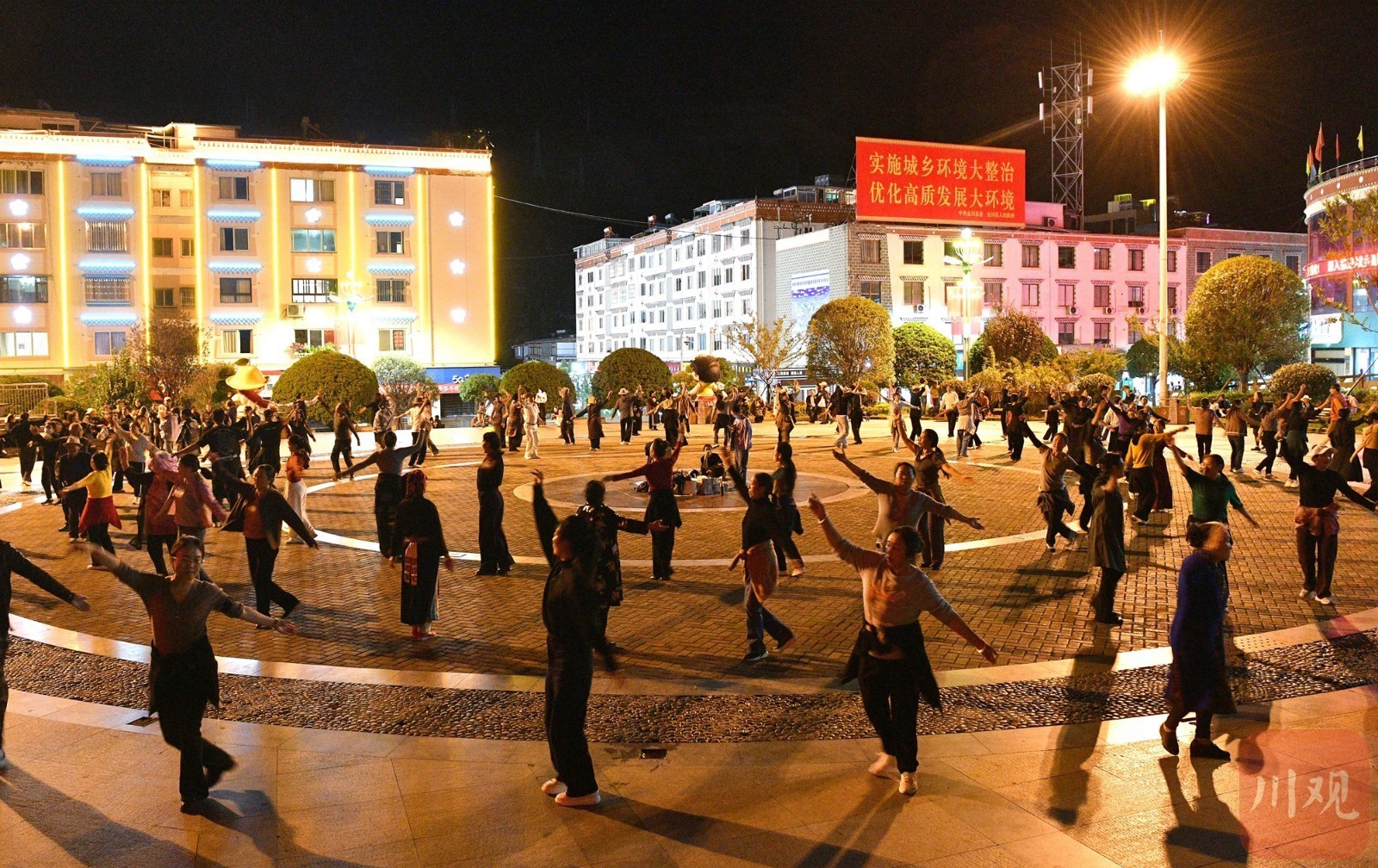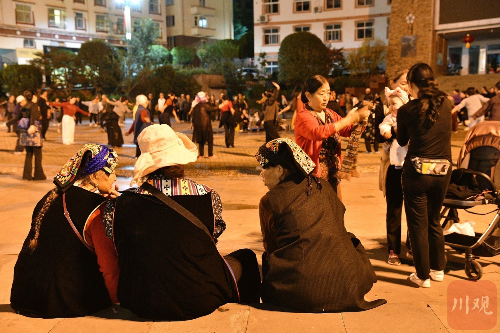 身穿民族服装的市民在县城广场观看锅庄舞。