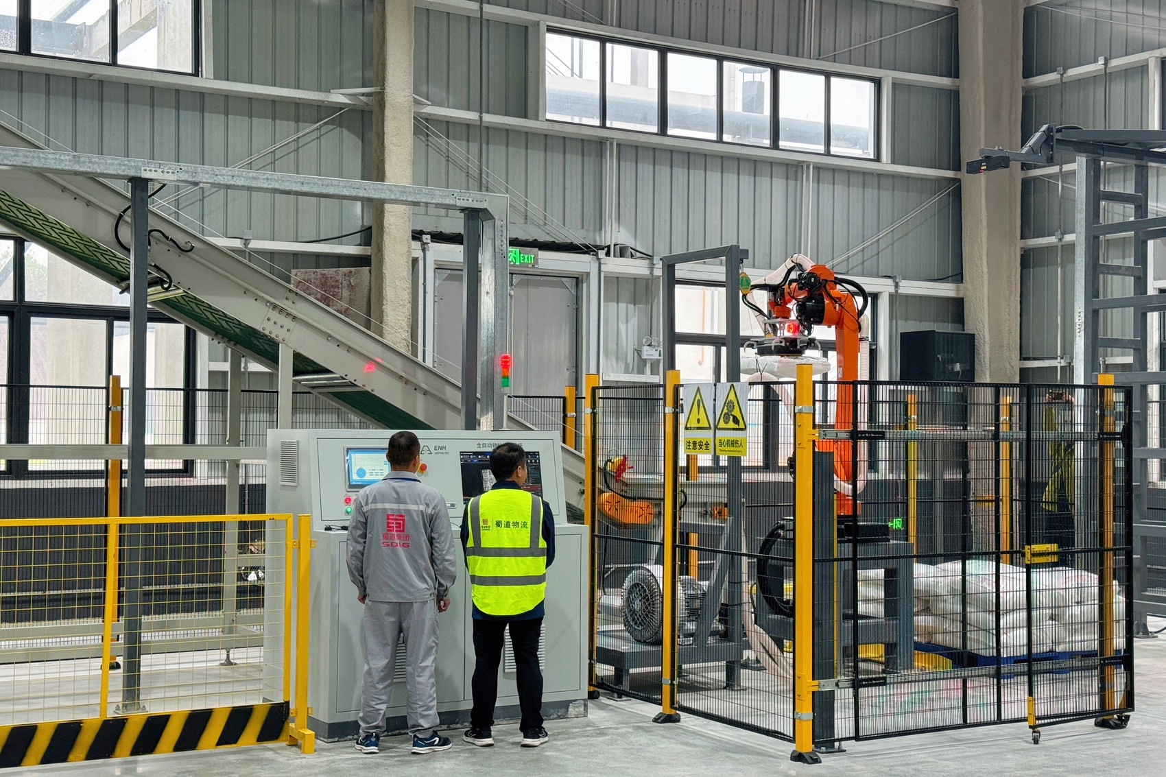 走进基地生产车间,只见一堆物料码放在指定区域,工人正在操作全自动物料拆包系统,无人叉车将各类原材料运送到机器人面前,机器人对物料进行影像识别、自动抓取,物料便经过传送带无缝对接至全自动拆包机。